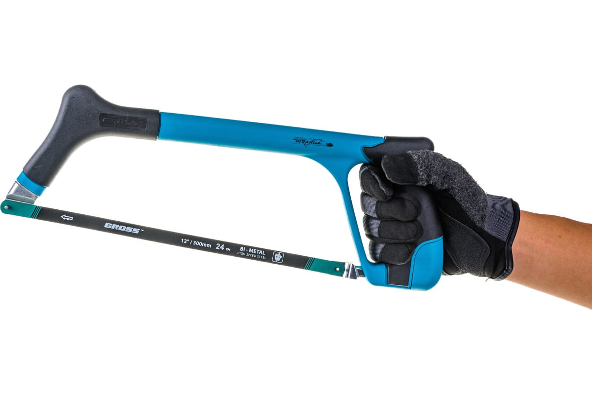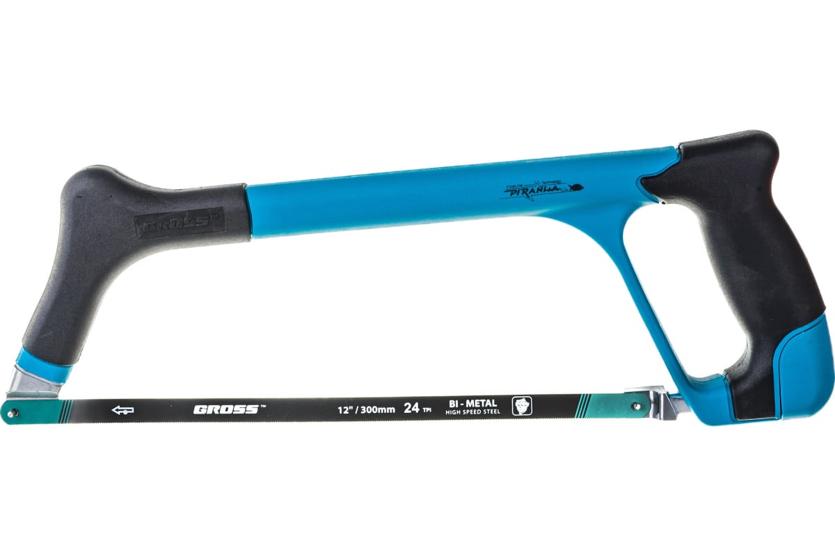 Ножовка по металлу Gross «PIRANHA» 77602, 300 мм, с трехкомпонентной металлопластиковой рамкой, рассчитана на профессиональное использование. Позволяет выполнять не только поперечный, но и продольный рез, т.к. имеется возможность установки полотна под углом 45° и 90°. Благодаря винтовому механизму можно регулировать степень натяжки полотна для повышения точности реза.