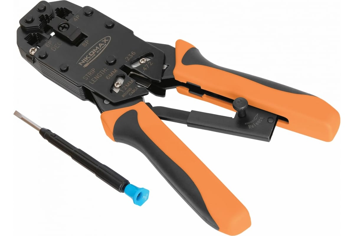Ручной обжимной профессиональный инструмент NIKOMAX 3 гнезда, торцевой, с храповиком NMC-2008AR (кримпер) используется для обжима коннекторов на телефонных кабелях и на кабелях передачи данных.