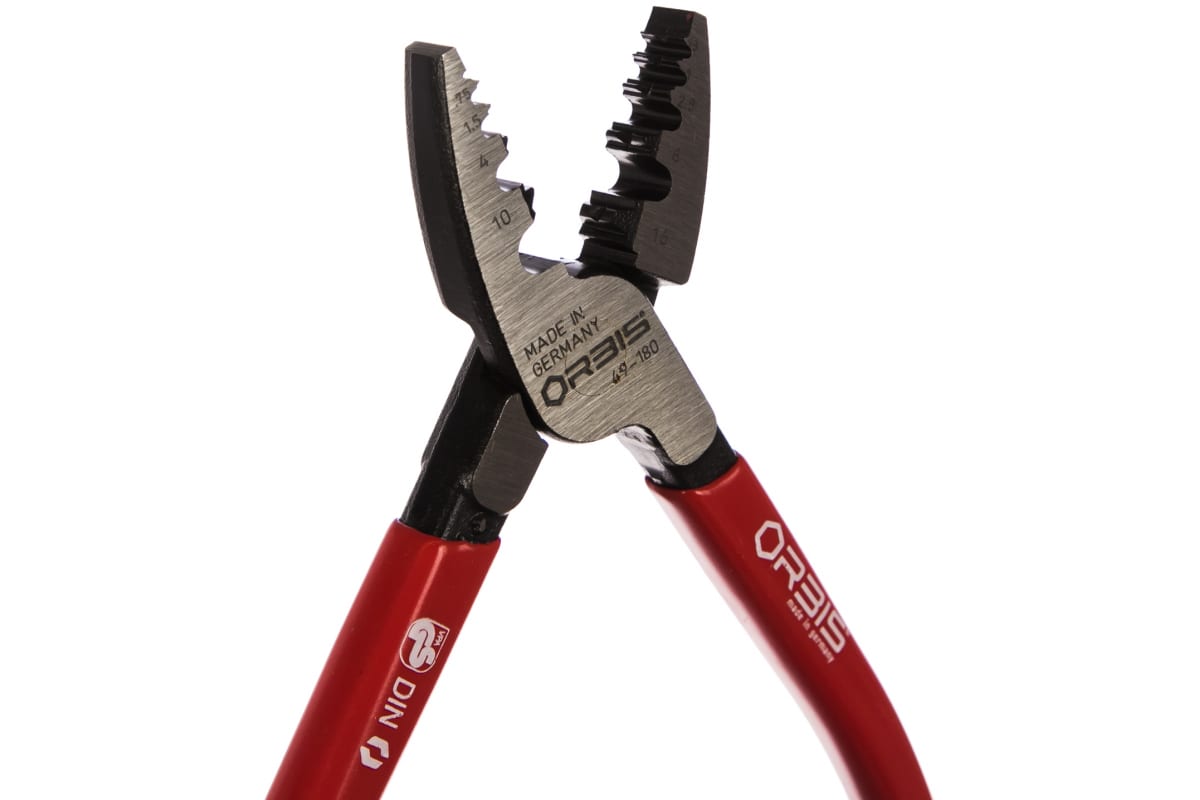 Обжимные клещи 180 мм OrbisWill 49-180/2622 рассчитаны на типовые размеры наконечников в пределах 0.25-16 мм2.