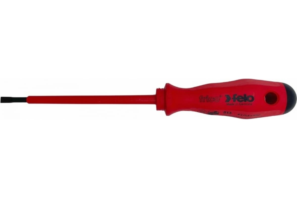 Отвертка Felo шлицевая диэлектрическая SL 4,0x0,8, 51304090 предназначена для работ с мелким крепежом типа SL в установках под напряжением до 1000 Вольт.