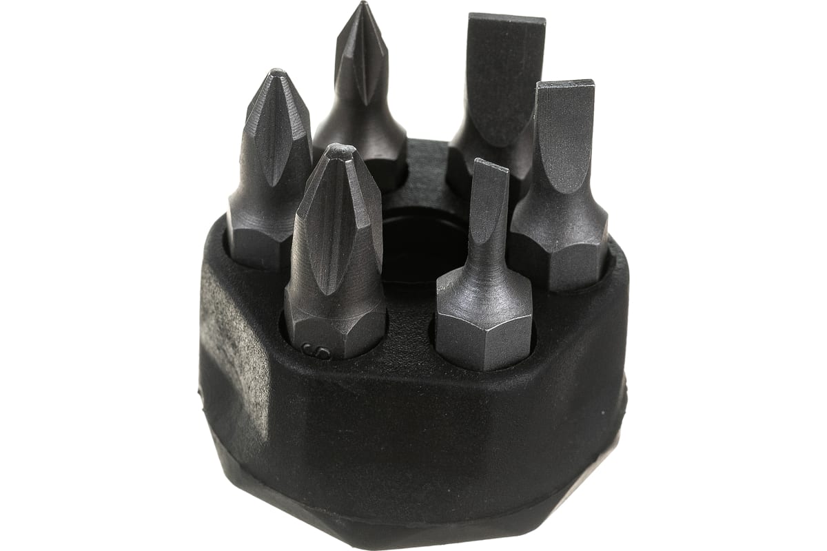 Сменные насадки-биты из инструментальной стали S2 выдерживают постоянные нагрузки за счет многоступенчатого процесса закаливания. Наконечники дополнительно закалены и намагничены. Двухкомпонентная эргономичная рукоятка оснащена мягкими прорезиненными вставками и отверстием для подвешивания.
