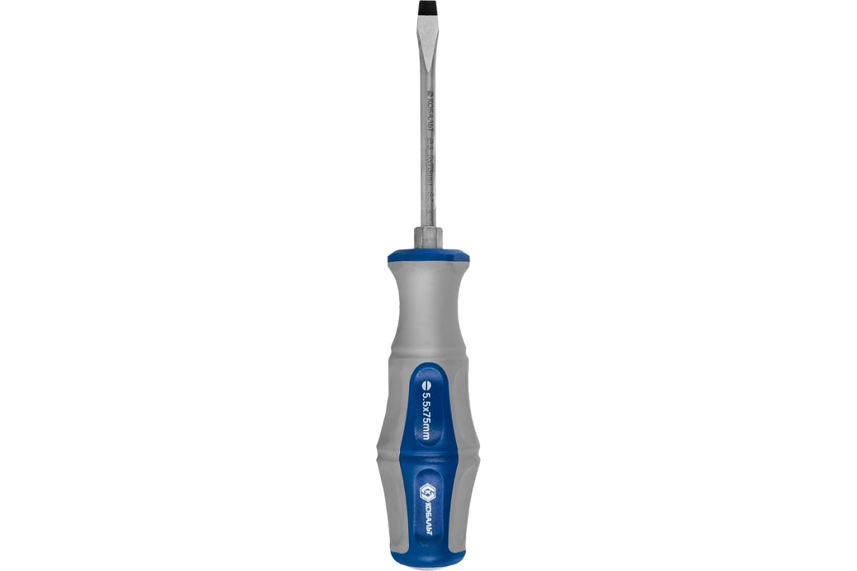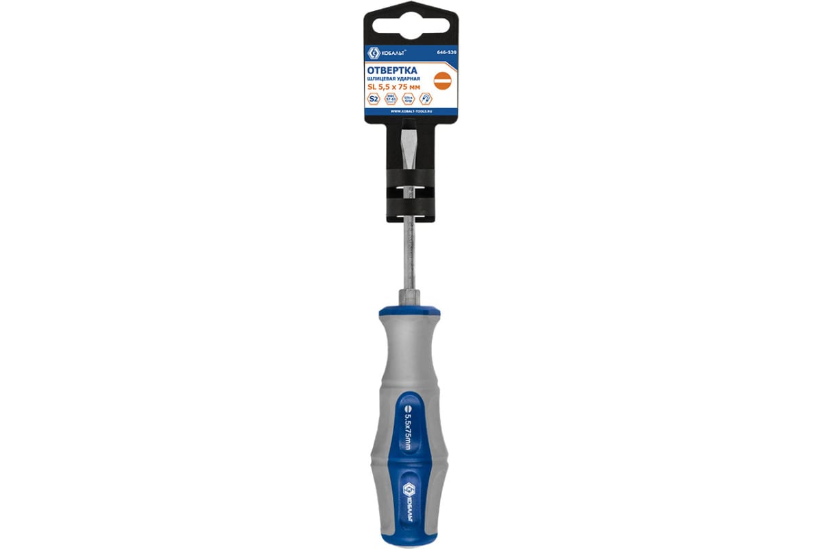 Отвертка ударная Ultra Grip SL 5.5 x 75 мм S2 КОБАЛЬТ 646-539 применяется для работ с резьбовыми крепежом, а также как ударный инструмент. Магнитный наконечник, встроенный в стержень из качественной стали, обеспечивает точный контроль над крепежом в его фиксацию. Ручка отвертки крепко лежит в руке во время рабочего процесса.