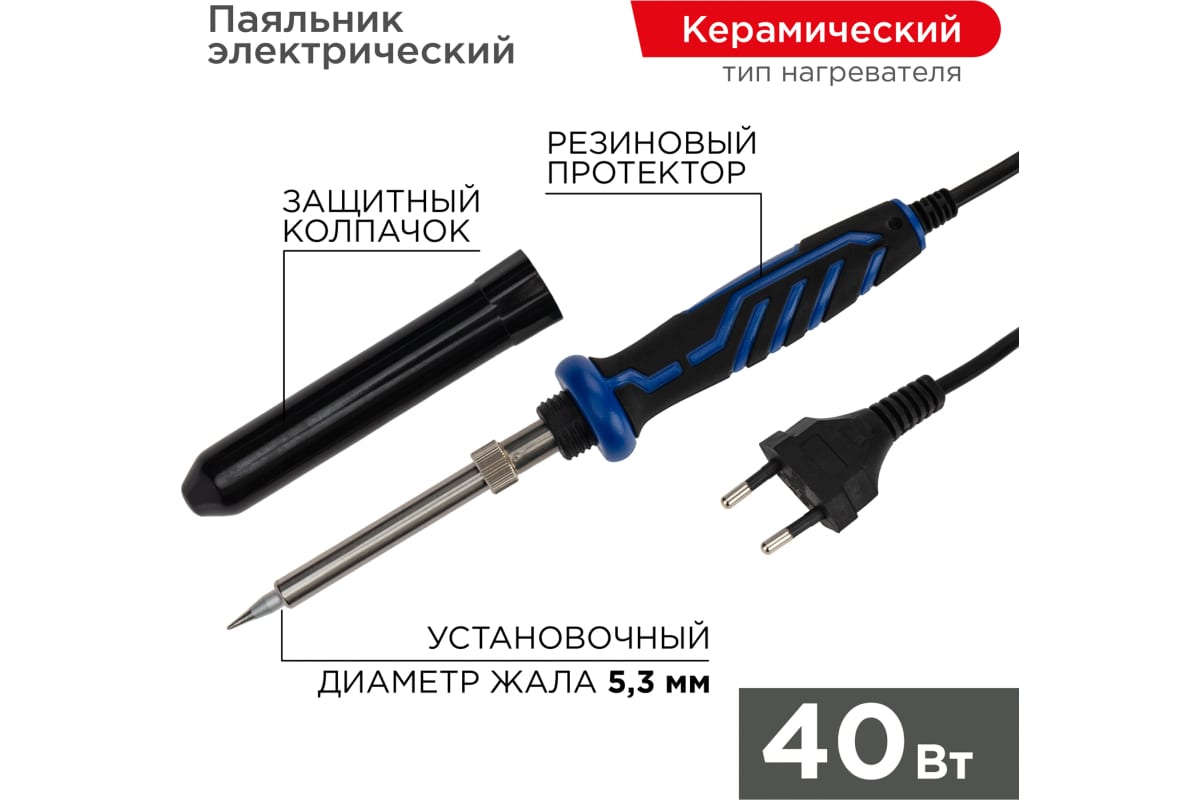 Паяльник с керамическим нагревателем серии ПРОФИ мощностью 40Вт REXANT предназначен для ручного монтажа/демонтажа электронных компонентов и других мелких и средних деталей. Подходит как для любительского, так и для профессионального использования. Долговечное жало паяльника состоит из медьсодержащего сердечника, покрытого слоем электролитически осажденного железа, отличающегося высокой стойкостью к коррозии. При соблюдении ряда предосторожностей жало способно работать длительное время без утраты эксплуатационных свойств, а в случае необходимости его можно легко и быстро заменить (сменное жало в комплект не входит).