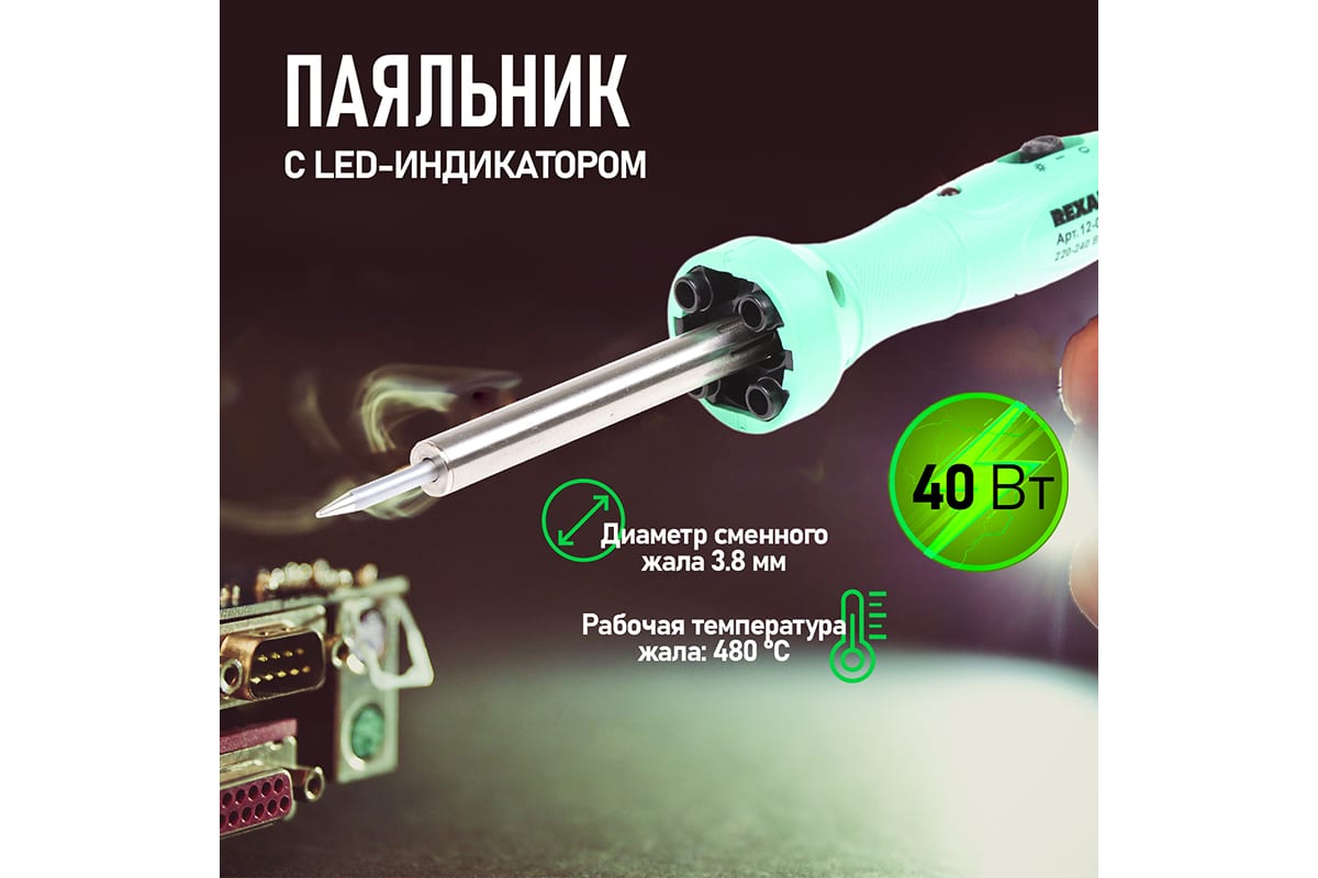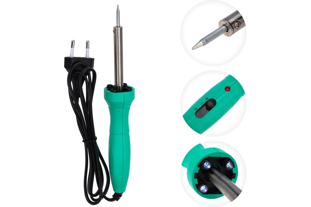 Паяльник с нагревателем REXANT LED подсветкой 12-0138 - на корпусе расположены индикатор питания и клавиша включения LED подсветки с четырьмя яркими светодиодами.