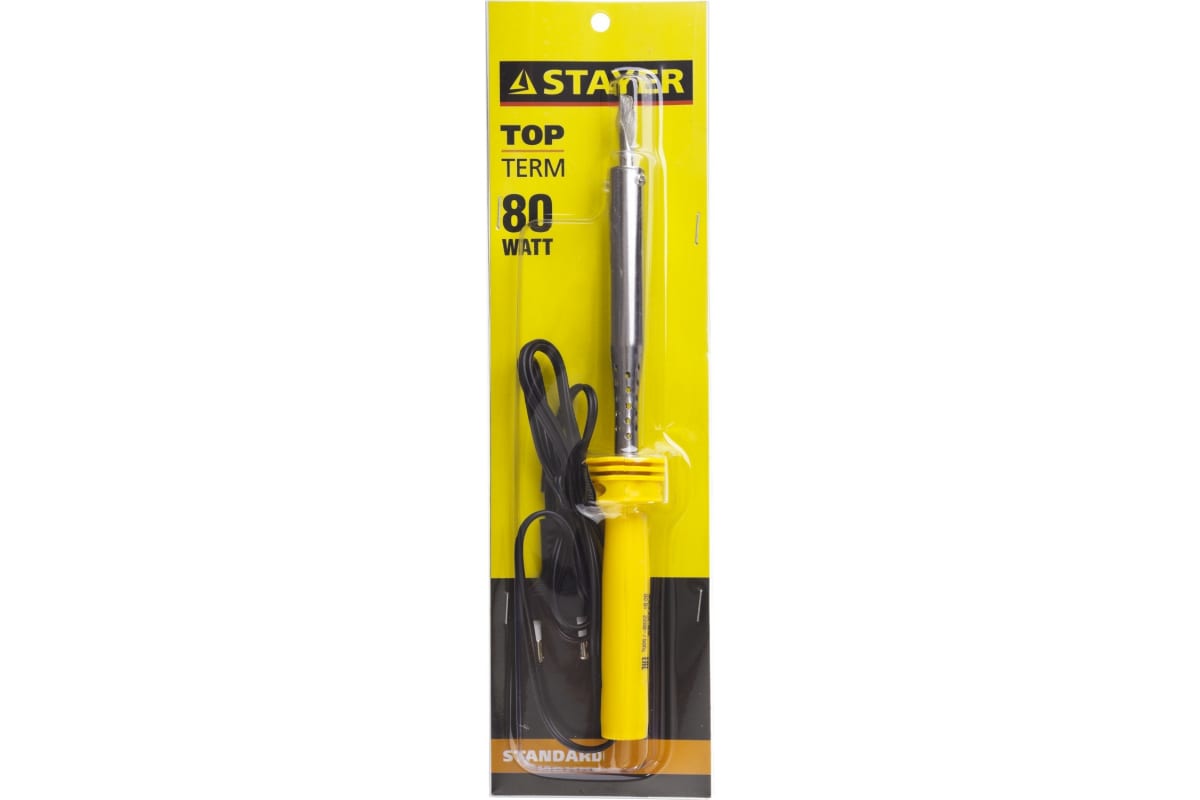 Паяльник с пластмассовой рукояткой и долговечным жалом, 80Вт, клин STAYER STANDARD 55330-80 - надежное электрическое паяльное устройство с прочным жалом, имеющим специальное покрытие, и удобной рукояткой из пластика эргономичной формы. Инструмент быстро нагревается и обеспечивает эффективную пайку. Высокая надежность и продолжительный срок эксплуатации обеспечиваются благодаря качественному нагревательному элементу.