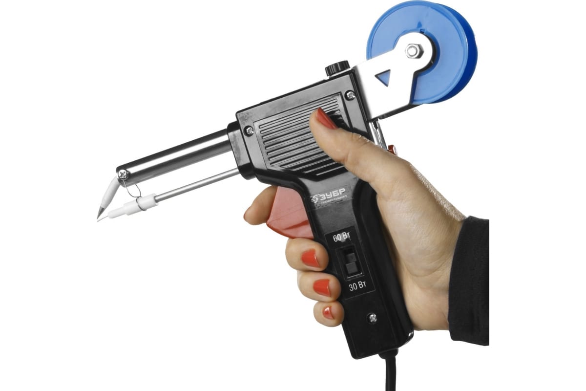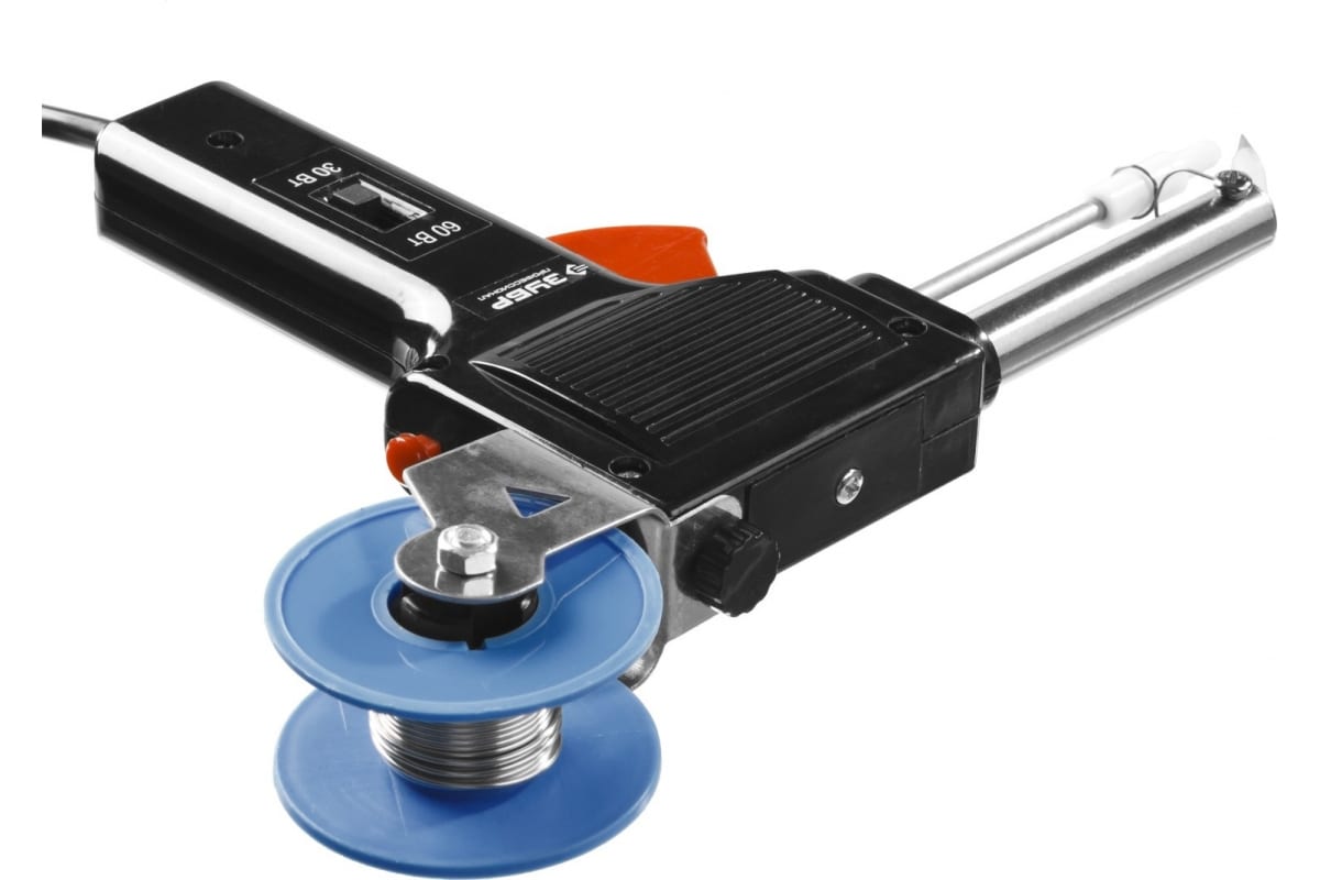 Преимущества ЗУБР ПРОФЕССИОНАЛ с подачей припоя, 2 мощности 30Вт/60Вт, диаметр проволоки припоя от 1 до 3мм 55304-60- Автоматическая подача припоя позволяет работать одной рукой и обеспечивает быструю и качественную работу;