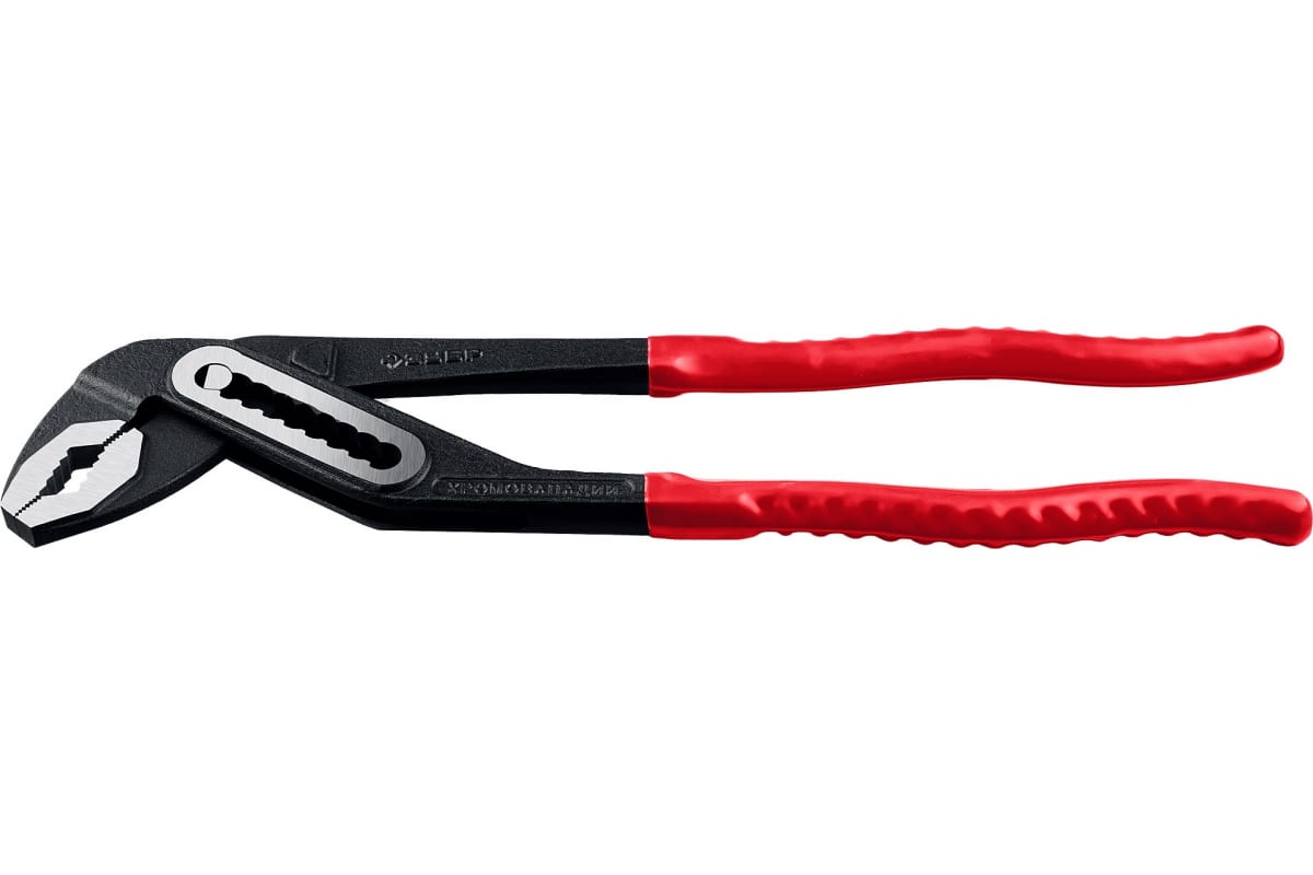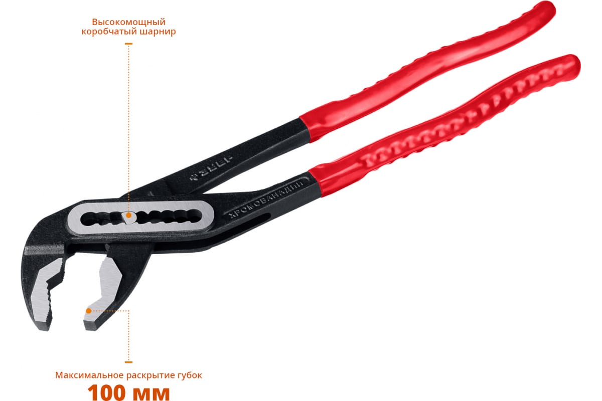 Переставные клещи Зубр Мастер Сr-V, высокомощный коробчатый шарнир, 400 мм, 2242-40 предназначены для выполнения различных слесарных работ, а также демонтажа деталей, не имеющих специального профиля.