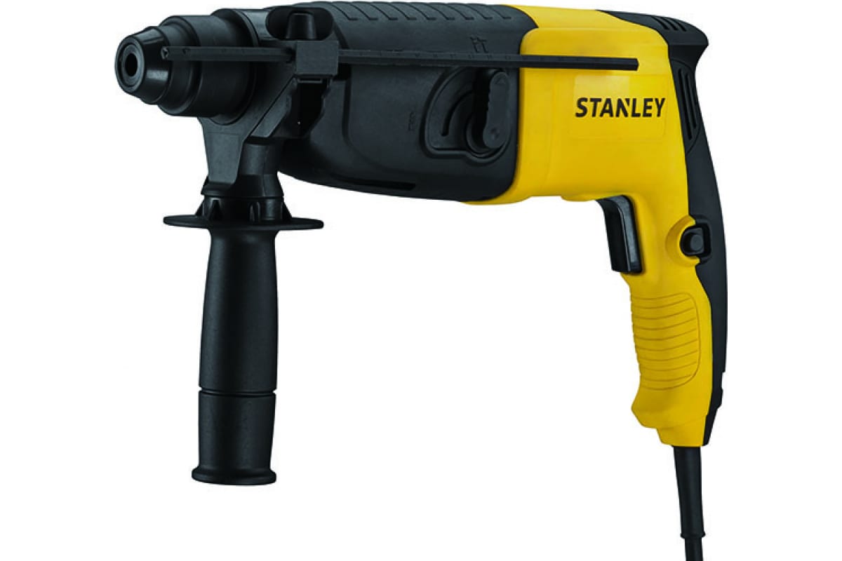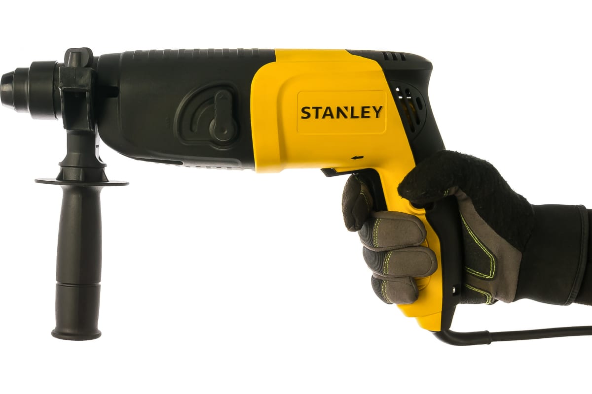 Перфоратор Stanley STHR202K работает в двух режимах - сверления и сверления с ударом. Выбрать один из них можно с помощью тумблера сбоку на корпусе. Обороты регулируются усилием нажатия на клавишу "Пуск", что очень удобно при осуществлении аккуратного засверливания. Боковая рукоятка помогает распределять усилие на две руки.