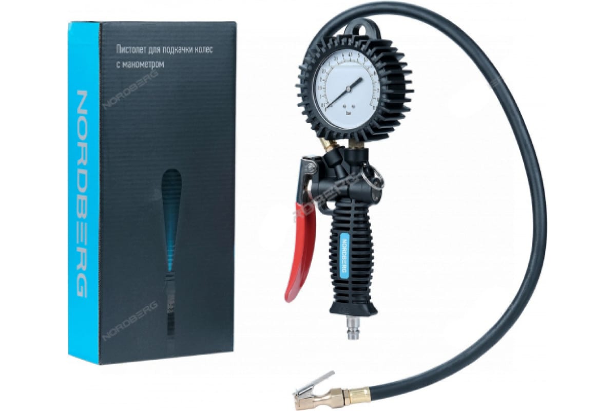 Пистолет для подкачки колес с жидкостным манометром NORDBERG Ti62 имеет эргономичный корпус с широкой управляемой рукояткой.