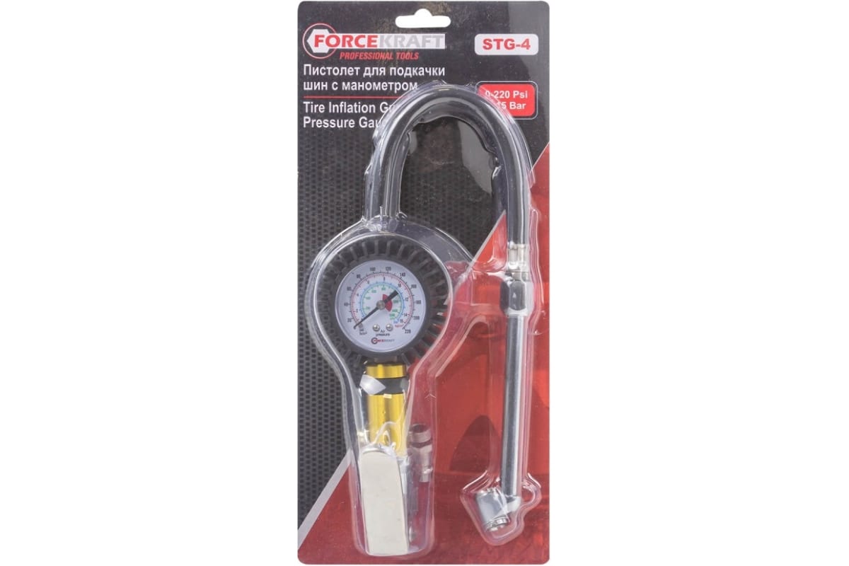 Пистолет для подкачки шин с аналоговым манометром FK-STG-4 предназначен для применения в шиномонтажных мастерских, станциях технического обслуживания автомобилей и мототехники, а также для автолюбителей.