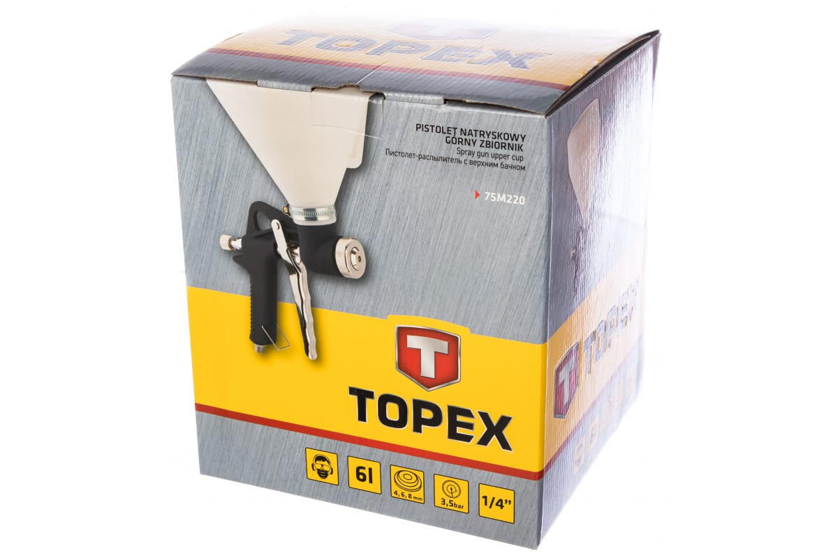 Пистолет-распылитель TOPEX 75M220 применяется для структурного окрашивания поверхностей. Оснащен пластиковым бачком объемом 6 л. Комплектуется тремя соплами диаметром 4, 6, 8 мм.
