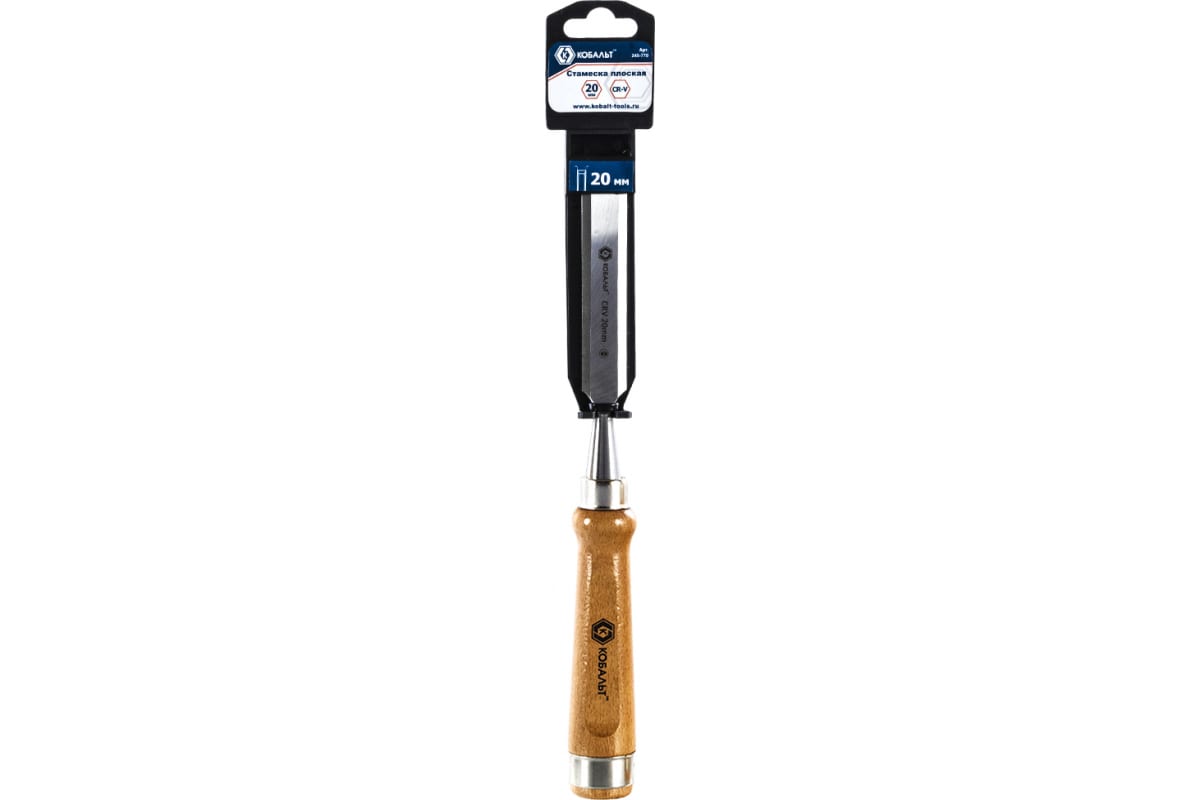 Плоская стамеска 20 х 140 мм, CR-V КОБАЛЬТ 245-770 предназначена для обработки мягкой древесины и древесины средней твердости, выборки пазов, при выполнении плотницких и столярных работ. Изготовлена из хром-ванадиевой стали 60 CrV с закалкой режущей части до 58-60 HRC. Деревянная рукоятка, обладая малой теплопроводностью, идеально подходит для работ в холодных условиях, существенно улучшает эргономику, уменьшает утомляемость руки и повышает комфортность работы. Порода древесины - бук. На рукоятке прочно установлено стальное кольцо для предотвращения растрескивания рукоятки при работе ударным инструментом. Работая стамеской не использовать металлический молоток, использовать деревянную киянку. Угол заточки 25° позволяет эффективно выполнять резание вдоль волокон и рубку поперек без опасности выкрашивания режущей кромки. Не использовать стамеску в качестве рычага. Для правки и грубой заточки использовать электрическое точило с обязательной подачей охлаждения для предотвращения отпуска стамески. Доводку микрофаски производить вручную с помощью мелкозернистого абразивного бруска - оселка.