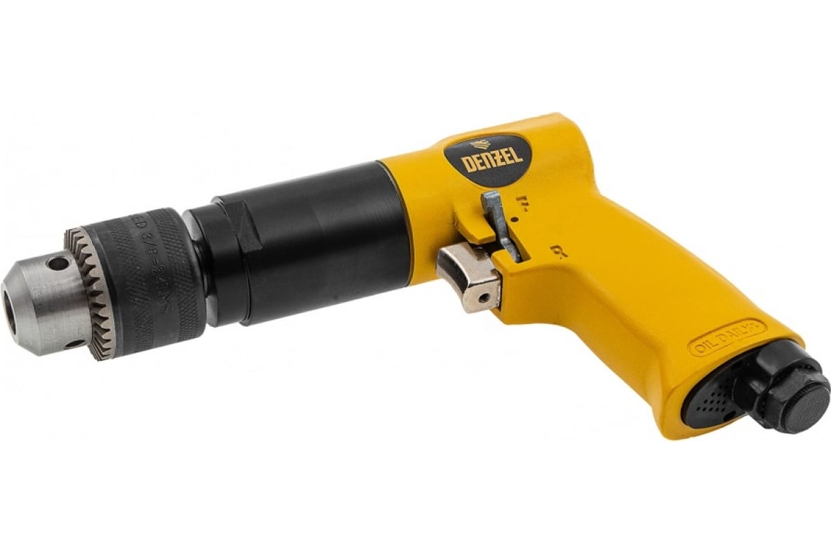 Пневматическая дрель Denzel PD500 57478 с ключевым патроном 1,5-13 мм работает со скоростью 500 об/мин при среднем расходе сжатого воздуха 114 л/мин.