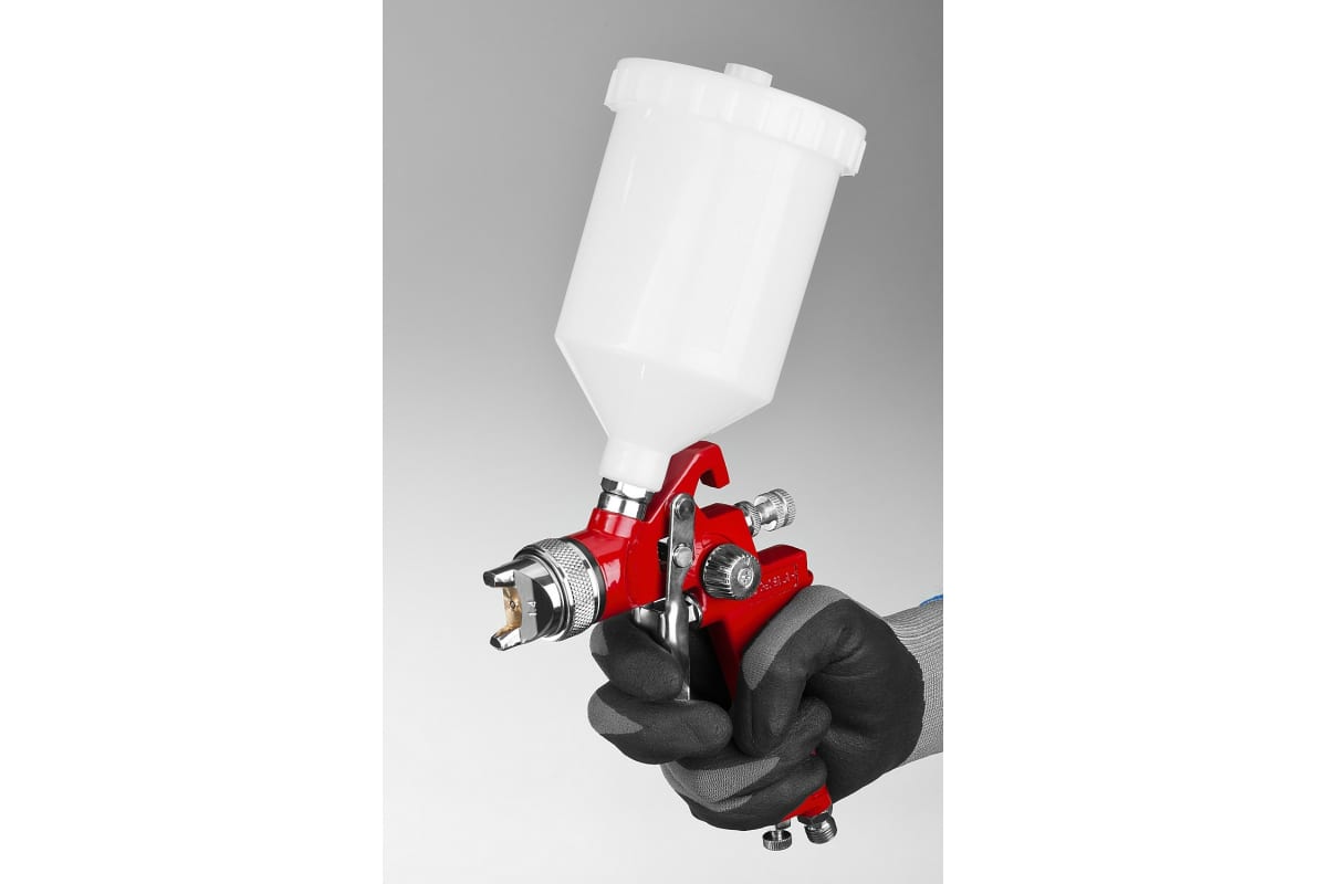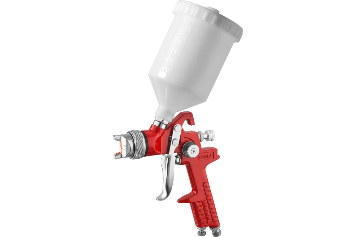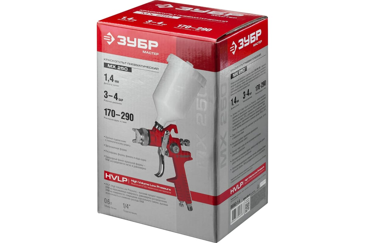 Пневматический краскопульт c верхним бачком Зубр МАСТЕР МХ 250, 1.4 мм 06563-1.4 предназначен для нанесения лакокрасочных материалов, различных водных растворов и жидкой шпаклевки на различные поверхности. Пригодится для ответственных окрасочных работ в мастерских и станциях технического обслуживания.