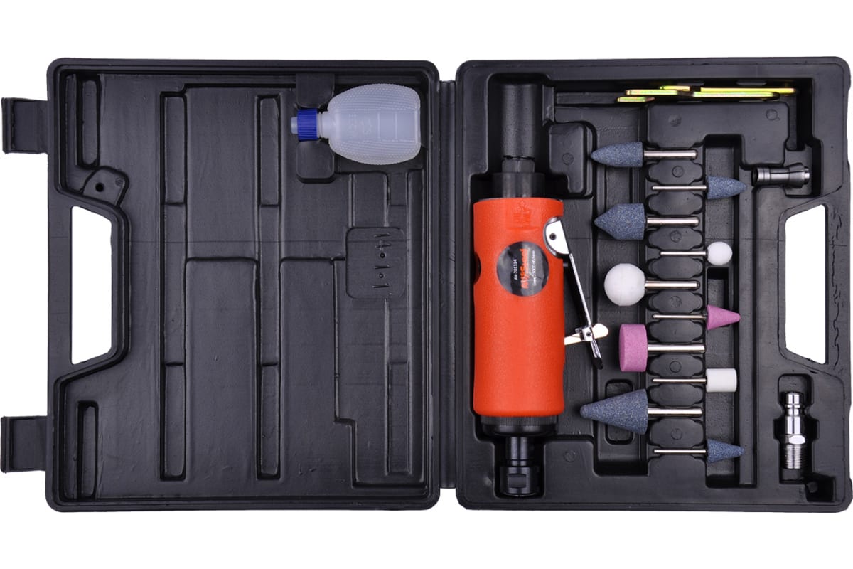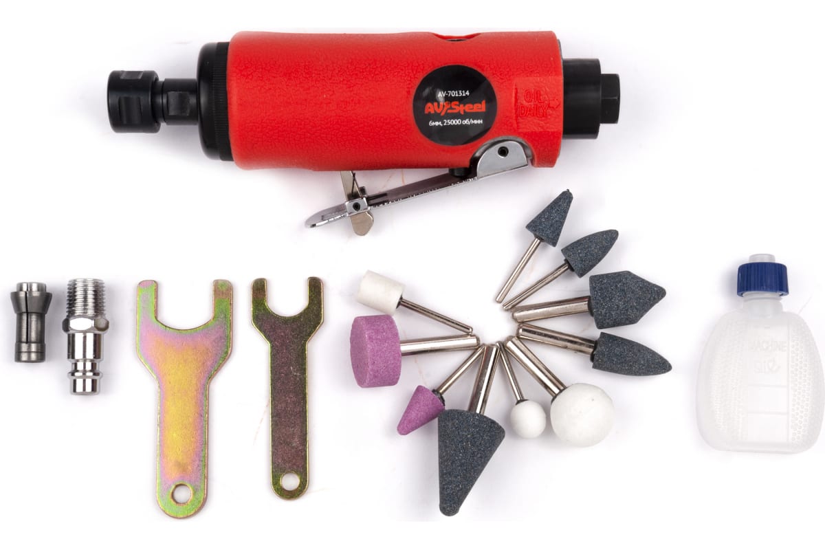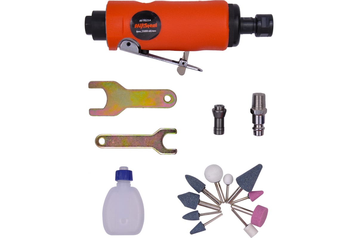 Пневмобормашина AV Steel с набором насадок AV-701814 может использоваться для шлифовки, зачистки, фрезерования и гравирования. Оснащена цанговым патроном на 6 мм, в комплектации имеется цанговый патрон на 4 мм. Поставляется в удобном пластиковом кейсе для переноски и хранения.