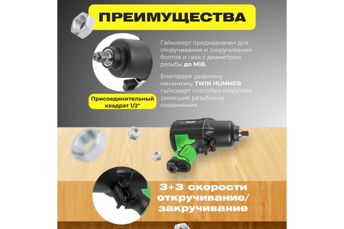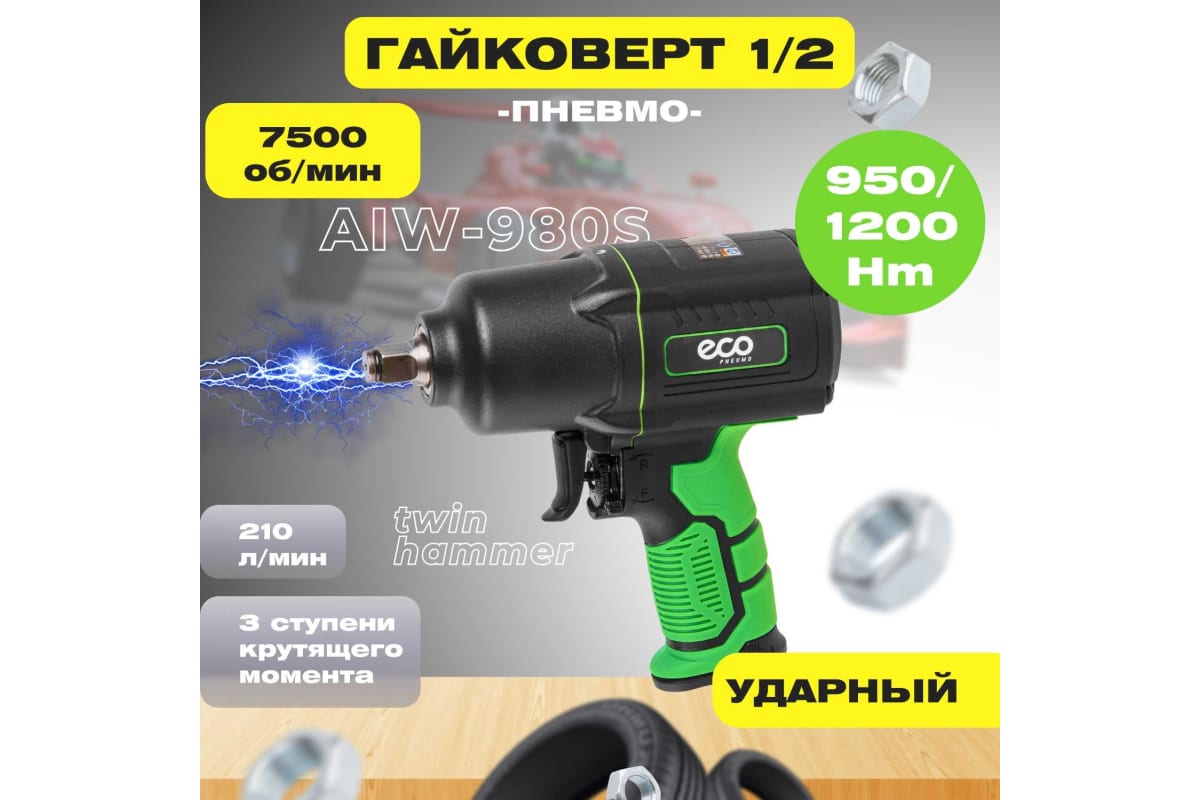 Пневмогайковерт ECO AIW-980S имеет эргономичный дизайн.