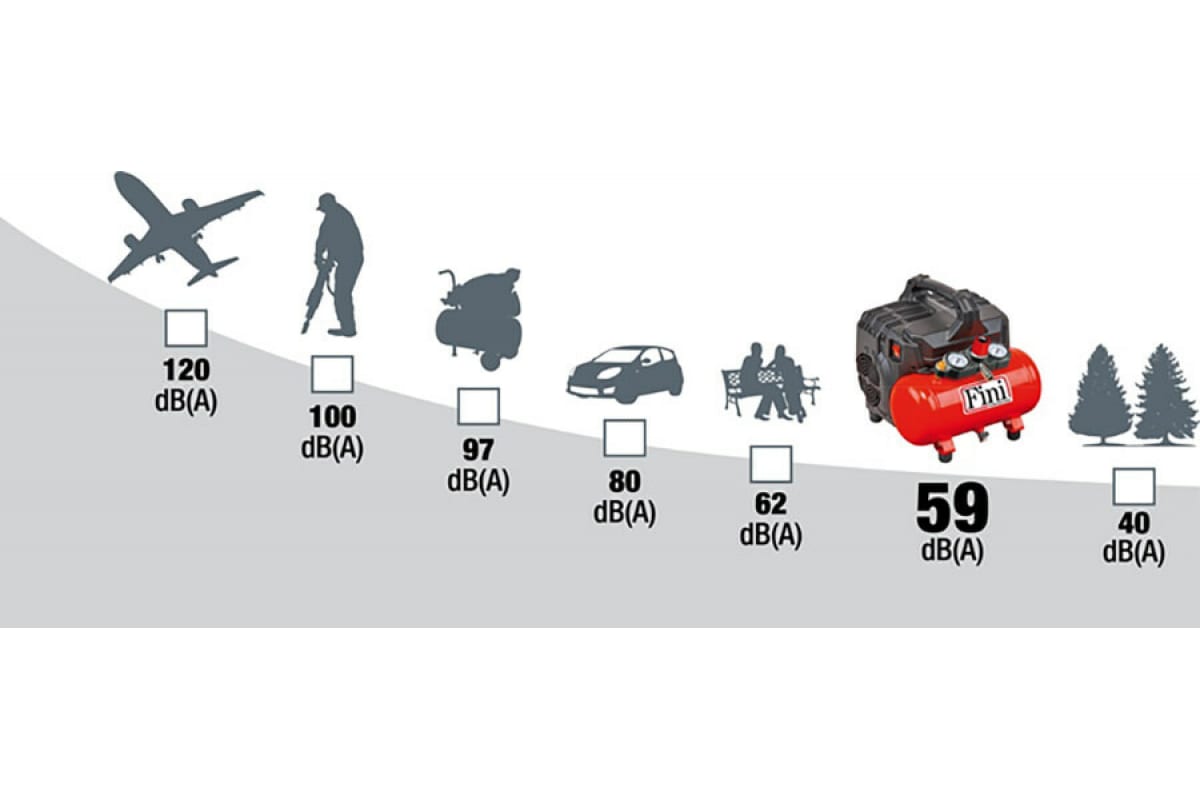 Поршневой малошумный безмасляный компрессор Fini SILTEK S/6 100540425 обладает небольшими размерами и подходит для подключения краскопульта или аэрографа. Главное преимущество модели - минимальный уровень шума, сравнимый с громкостью обычного разговора.