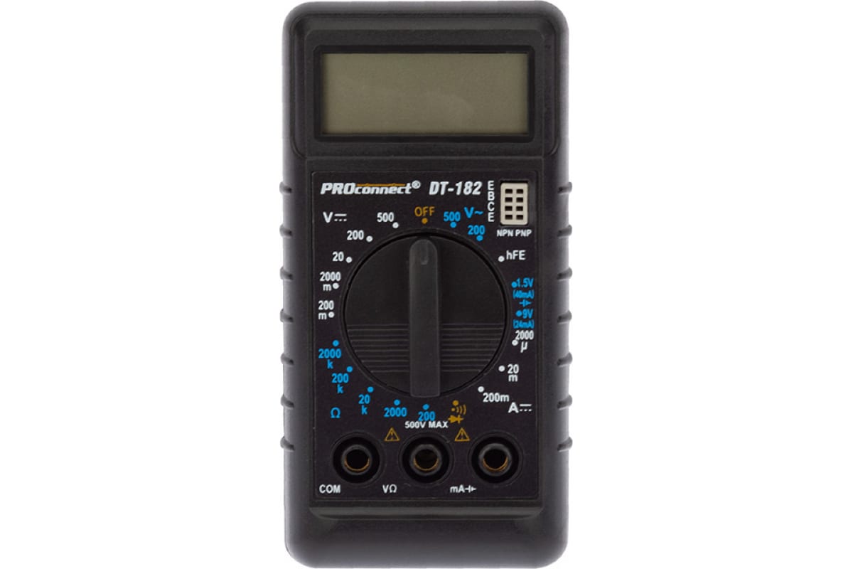Портативный мультиметр PROconnect М-18 13-3014 предназначен для измерения постоянного и переменного напряжения, постоянного тока, сопротивления, проверки диодов, транзисторов, прозвонки соединений, а также проверки батареек.