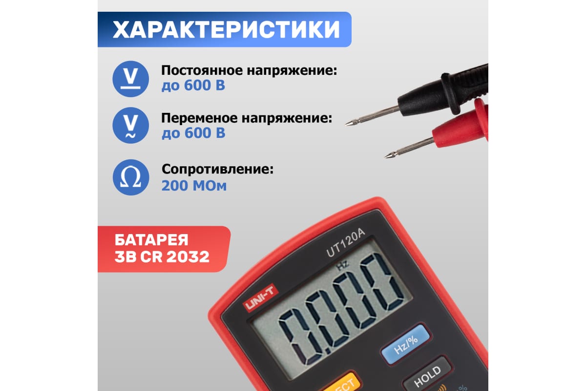 Несмотря на свой компактный размер, они включают в себя отличный набор функций. В мультиметре 120A есть функции измерения напряжения, сопротивления, частоты, тестирования диодов и прозвонки цепи, функция автоматического отключения и удержания данных. Также в комплекте поставляется защитный бокс и щупы.