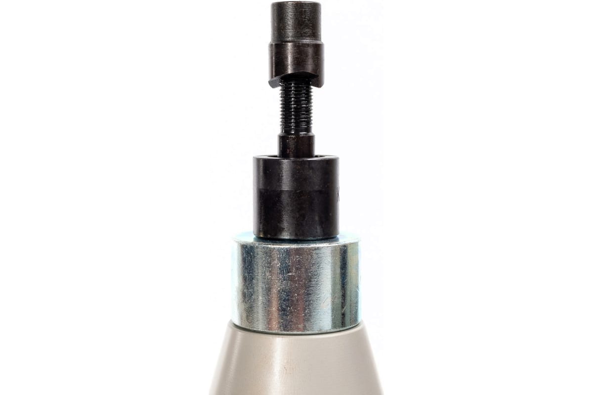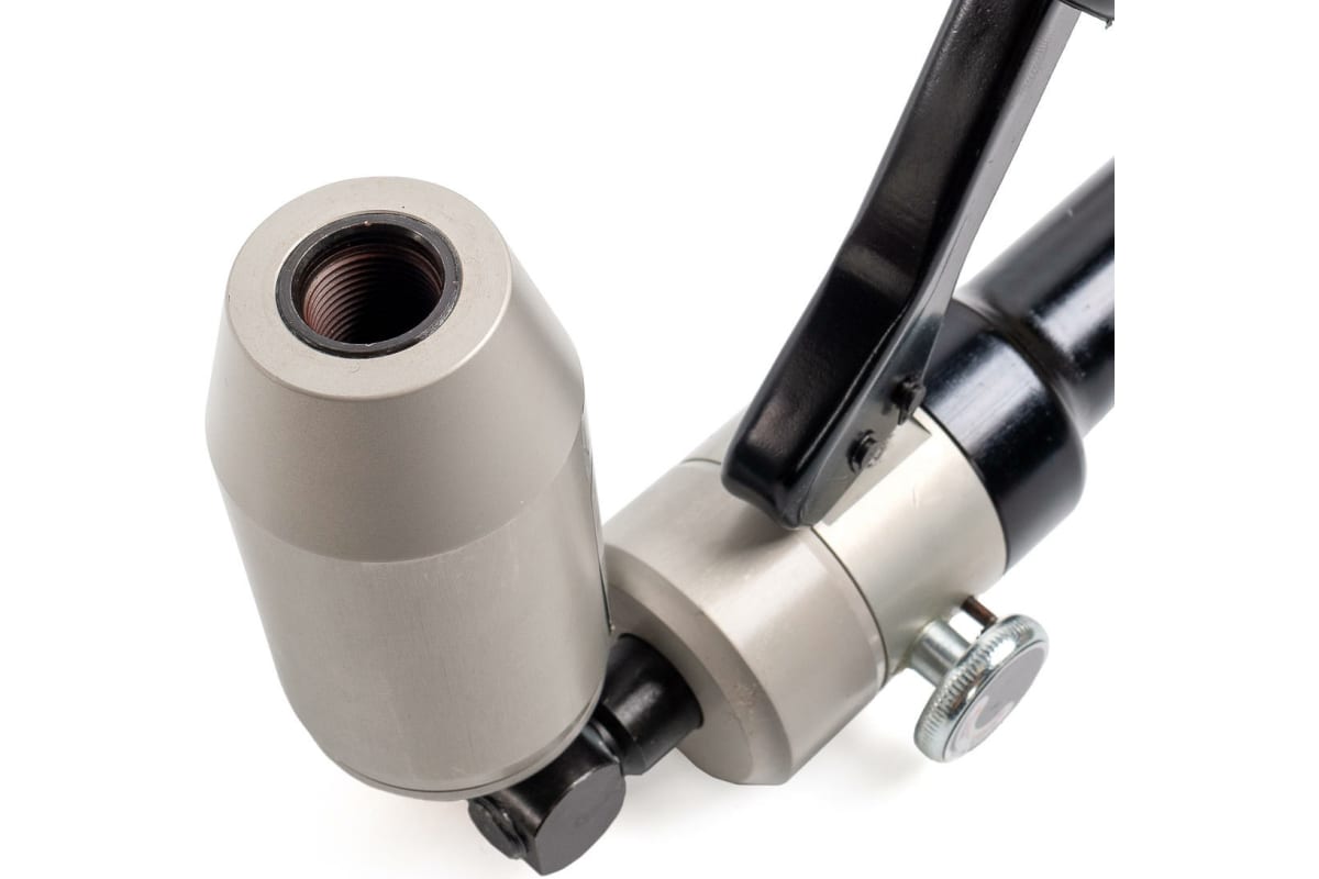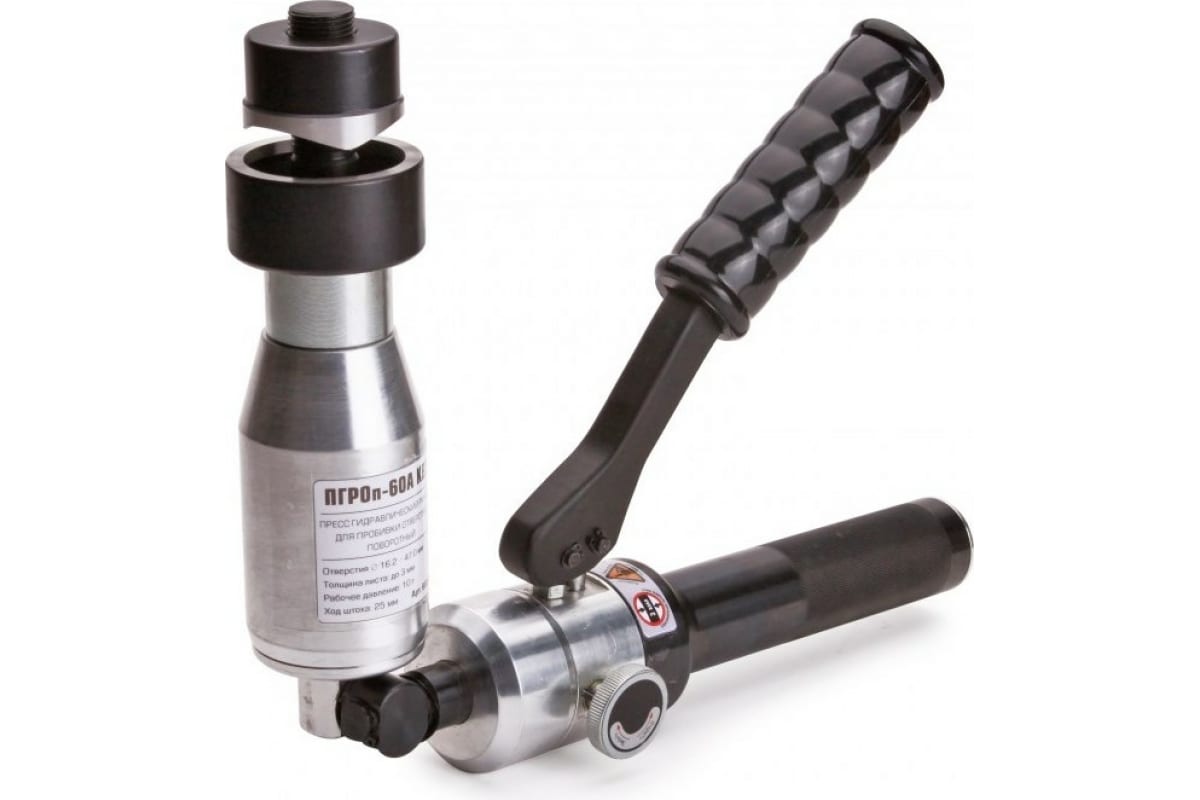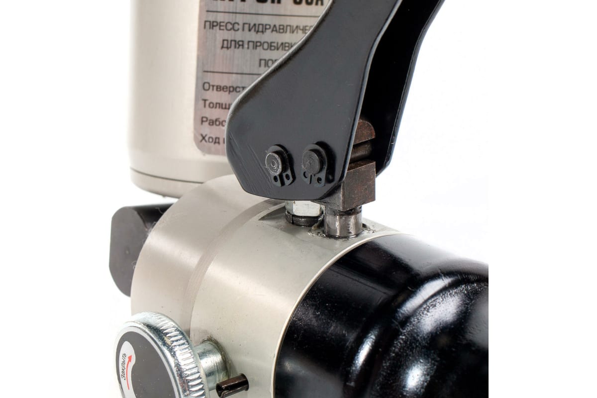 Поворотный гидравлический ручной пресс для пробивки отверстий КВТ ПГРОп-60А 66536 служит для изготовления отверстий диаметром 16.2 мм, 18.6 мм, 20.5 мм, 22.5 мм, 25.4 мм, 28.3 мм, 37 мм и 47 мм. В качестве рабочей жидкости используется гидравлическое масло объемом 70 мл. Алюминиевый сплав обеспечивает корпусу модели необходимую жесткость и легкость. Максимальная толщина пробиваемого стального листа (St 37) составляет 3 мм.