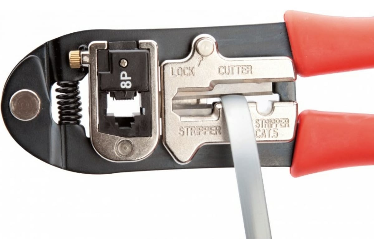 Преимущества пресс-клещей КВТ 69280- 3 в 1: обжим разъемов RJ, снятие изоляции с плоских телефонных проводов с фиксированной длиной зачистки, с круглых проводов типа UTP, STP, резка проводов;
