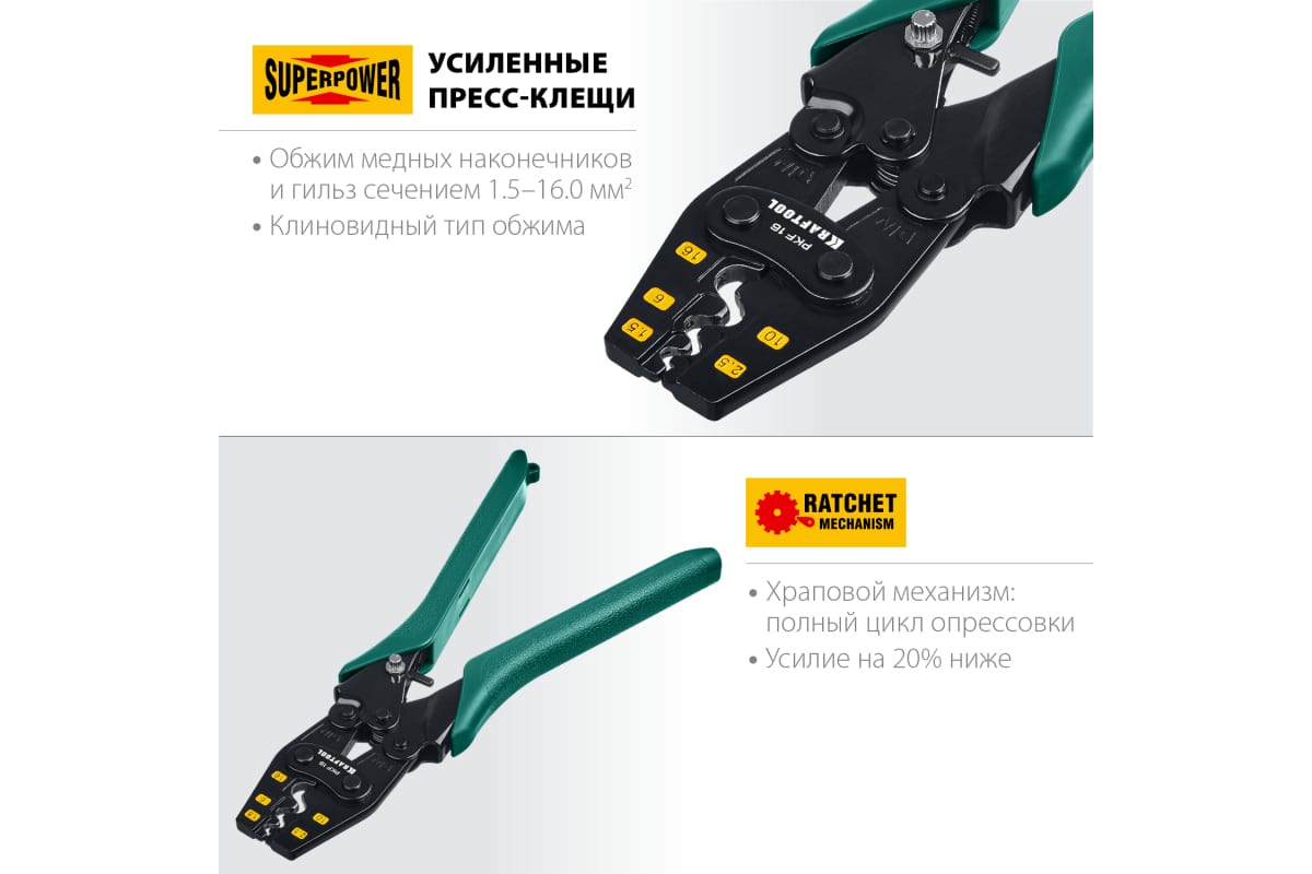 Преимущества пресс-клещей KRAFTOOL 45466- Храповый механизм обеспечивающий блокировку обратного хода до завершения полного цикла прессовки