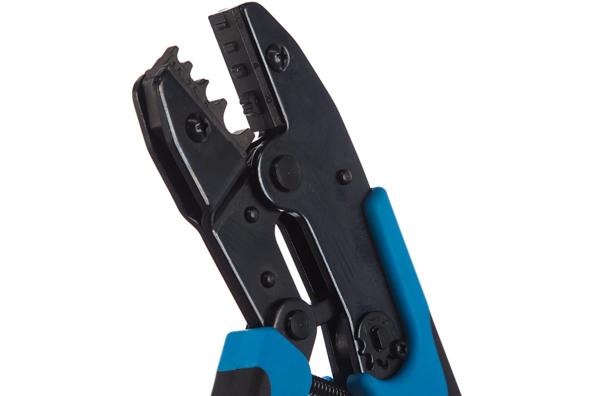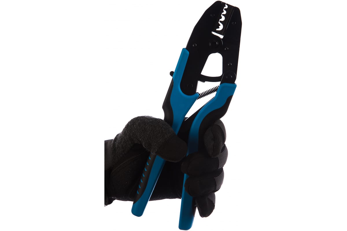 Пресс-клещи КВТ CTB-15 69973 используется с целью опрессовки неизолированных медных наконечников и гильз: ПМ, НШП, ГМЛ(о), наборы СОТК. Инструмент выполнен из стали толщиной 3 мм, обработанной воронением. Удлиненные рукоятки из термопластрезины снижают нагрузку на кисть на 30%. Встроенный храповый механизм обеспечивает блокировку хода, также кримпер имеет устройство разблокировки храпового механизма.