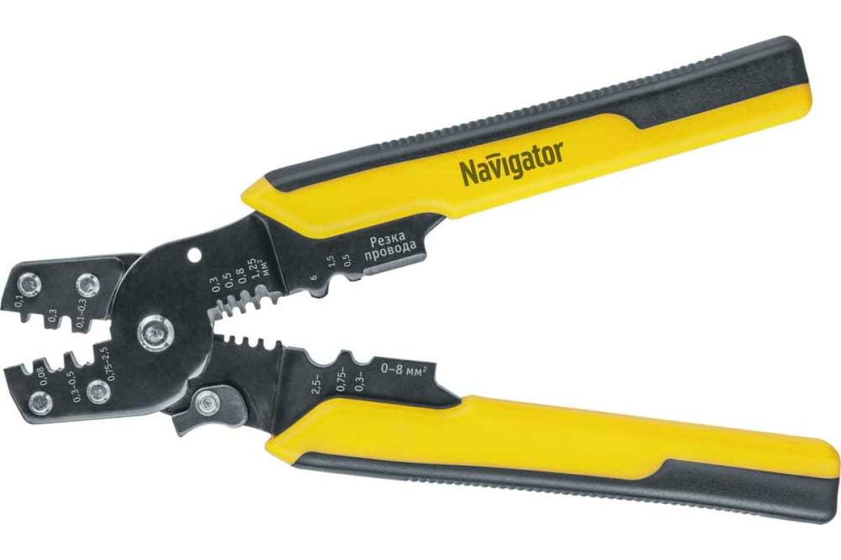 Пресс-клещи Navigator 80 445 nht-pkm02-4v1 (многофункциональные) 80445 предназначены для резки провода, снятия изоляции с одножильных и многожильных проводов, опрессовки изолированных и неизолированных наконечников и гильз, а также формирования криволинейных форм.