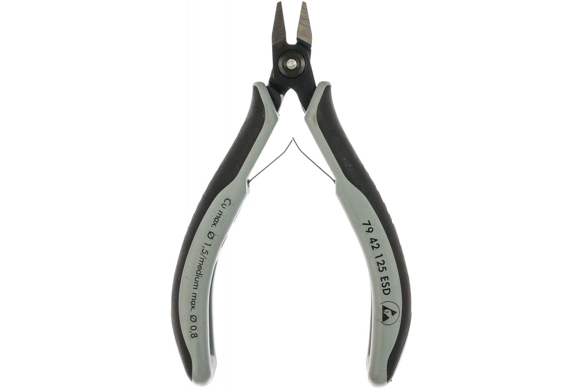 Прецизионные бокорезы для электроники Knipex KN-7942125ESD выполнены из хромистой стали, кованой и закалённой в масле. Они предназначены для резки мягкой проволоки диаметром 0,1 - 1,5 мм и для проволоки средней твёрдости диаметром до 0,8 мм. Бокорезы часто применяются в электронике и точной механике. Длина их составляет всего 125 мм.