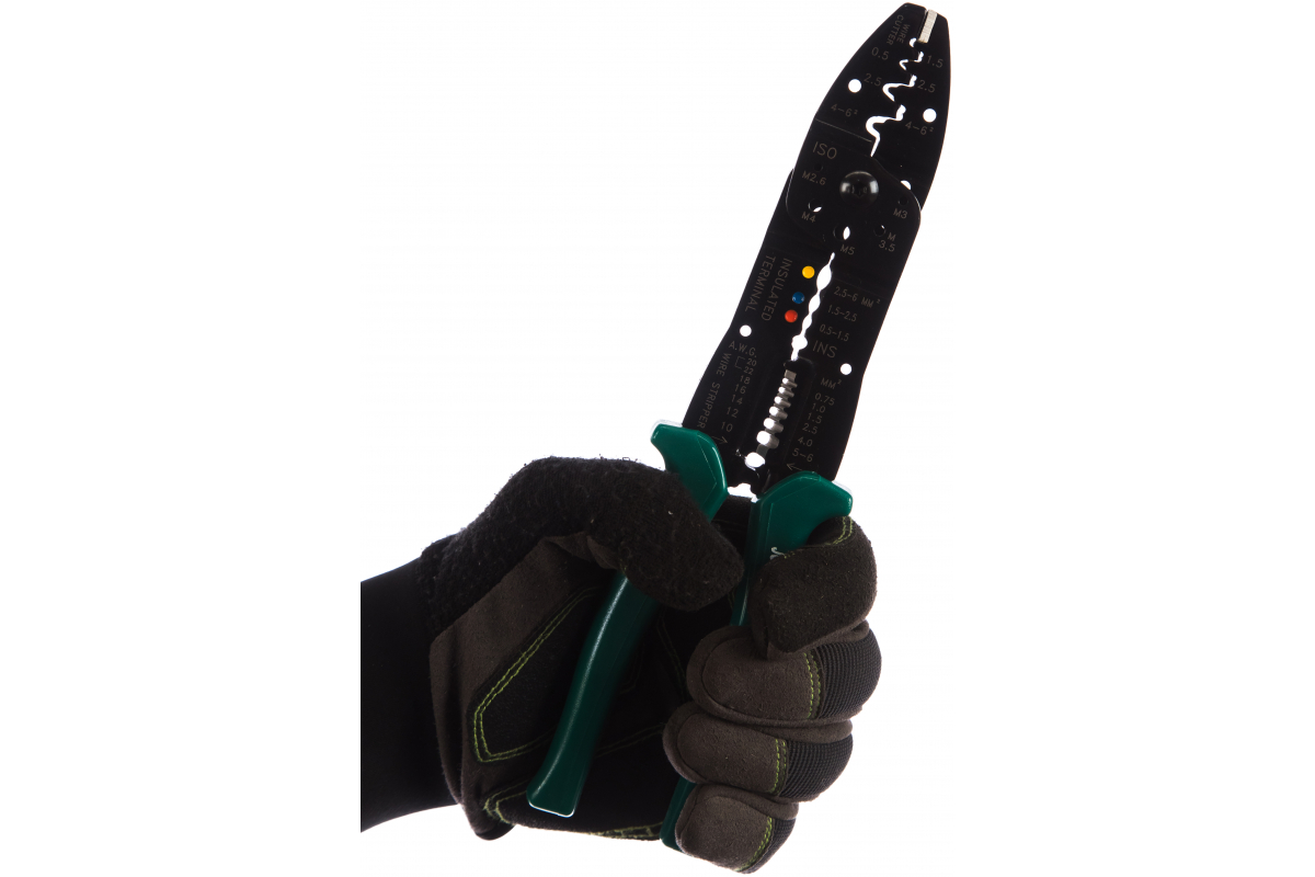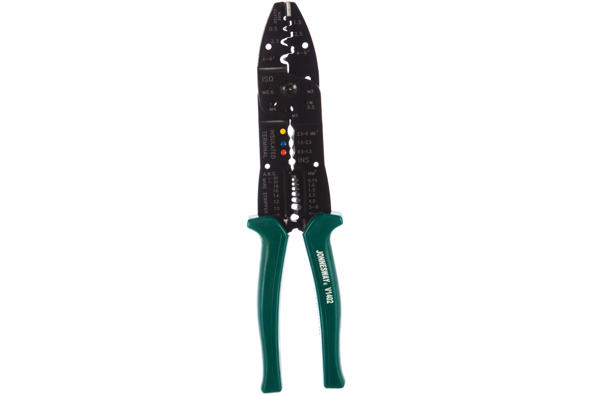 Профессиональный обжиматель контактов 8 в 1 Jonnesway V1402 оснащен специальной рукояткой, которая не пропускает электрический ток. Рабочая поверхность разделена на три части, для разного вида клемм.