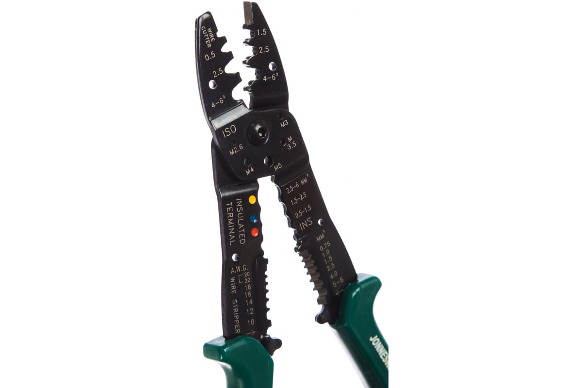 Преимущества обжимателя Jonnesway V1402- Накладки на рукоятке не пропускают ток.