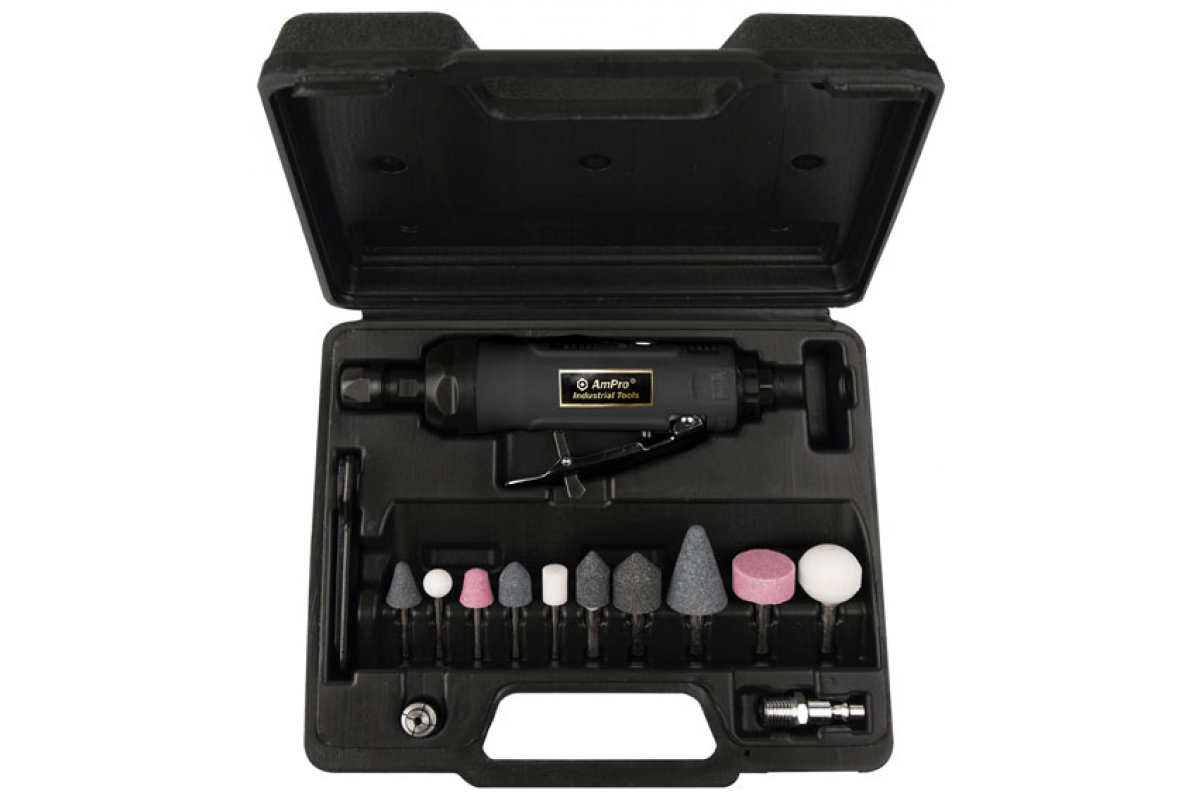 Прямая зачистная машинка с набором шарошек AmPro A6313 используется для снятия заусенец, шлифовки стыков и швов, обработки мелких деталей. Благодаря прочному жесткому корпусу внутренние узлы инструмента защищены от случайного повреждения или удара при эксплуатации. Сжатый воздух поступает в систему со скоростью 85 л/мин и разгоняет вращающиеся элементы до 22000 об/мин, что обеспечивает аккуратный и быстрый результат работы.
