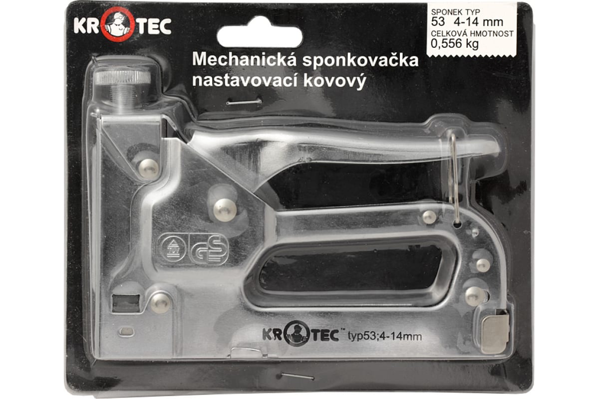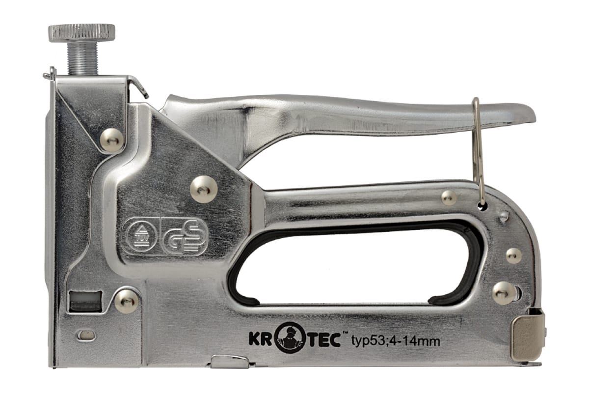Регулируемый механический степлер KROTEC тип 53, 4-14 мм, металлический 4301008 представляет собой ручной инструмент для крепления путём пробивания скобами. Предназначен для внутренней отделки и декоративных работ. Степлер используется во время выполнения столярных работ, для крепления материала из гипсокартона, пластика, ДСП и схожих материалов к другим различным поверхностям.
