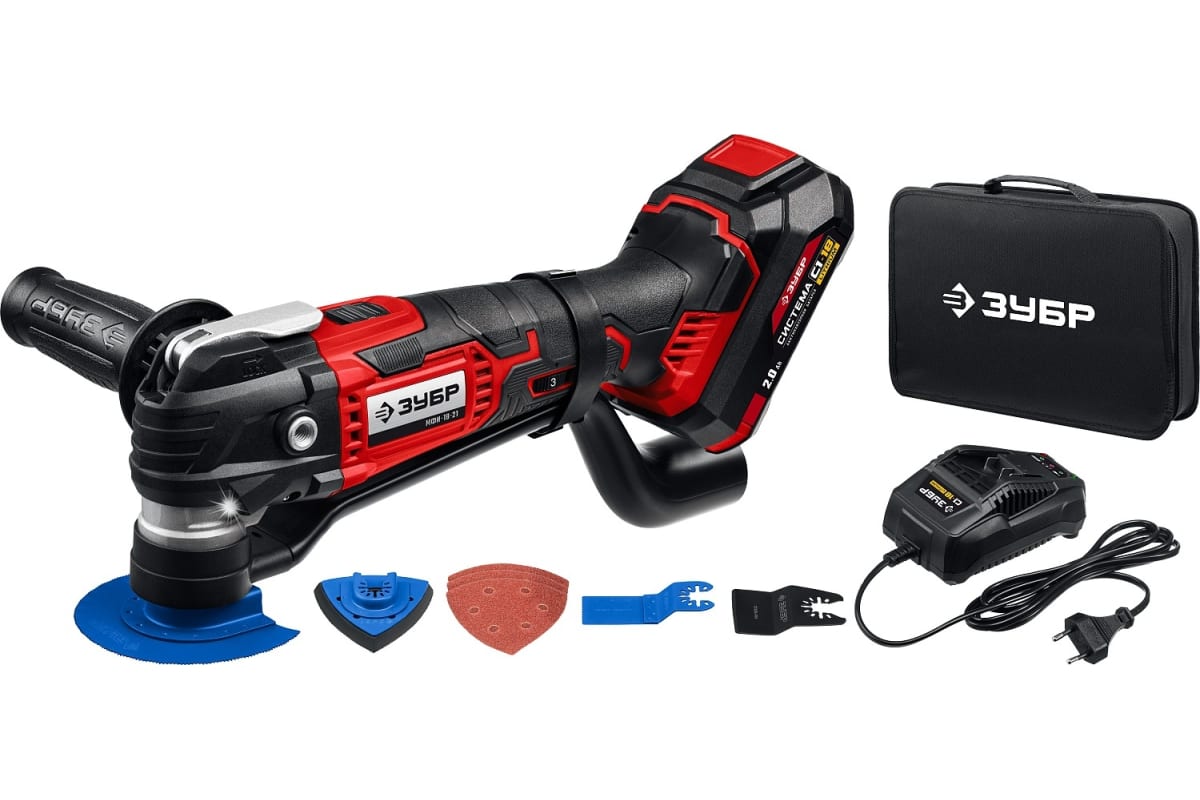 Реноватор ЗУБР 18 В, 1 АКБ (2 Ач), набор насадок, сумка МФИ-18-21 - универсальное устройство для разных строительных работ (резка, шлифование), особенно в труднодоступных местах и в отсутствие доступа к электричеству. Большой угол колебаний 3 градуса в сочетании с широким спектром регулировки частоты обеспечивают эффективную работу с любым материалом.