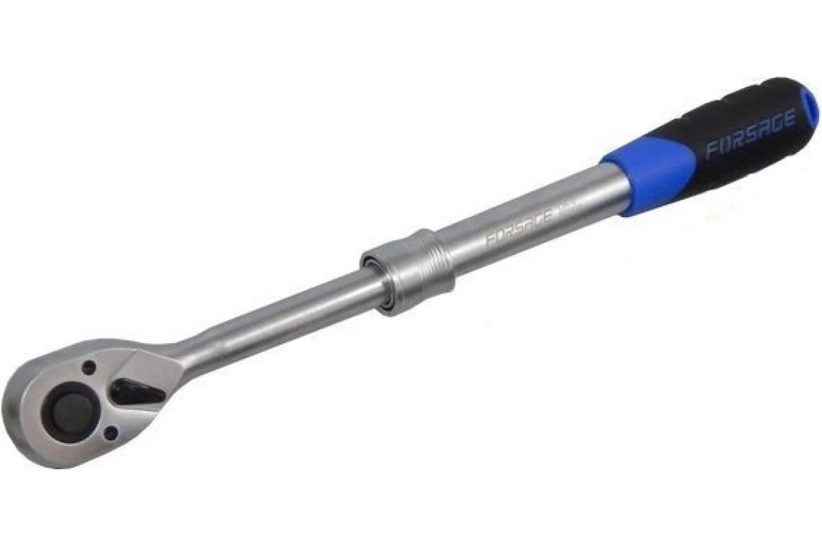 Реверсивная телескопическая трещотка Forsage шарнирная, с резиновой ручкой 1/2" L340-430 мм 15796 F-802423 используется для работ с резьбовыми соединениями и крепежом при монтажных и ремонтных работах. Инструмент выполнен из высококачественной стали высокой прочности.