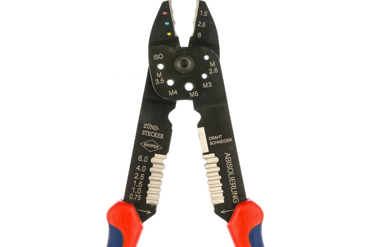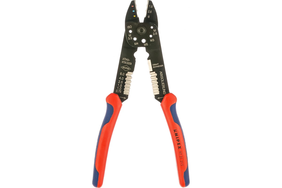 Ручной обжимник KNIPEX KN-9721215 - специальный инструмент для разрезания кабелей, удаления изоляции и опрессовки штекеров. Имеет надежную конструкцию, так как изготовлен из специальной высокопрочной стали. Чехлы на рукоятках обеспечивают комфорт во время работы. Максимальная площадь опрессовки 6 мм.