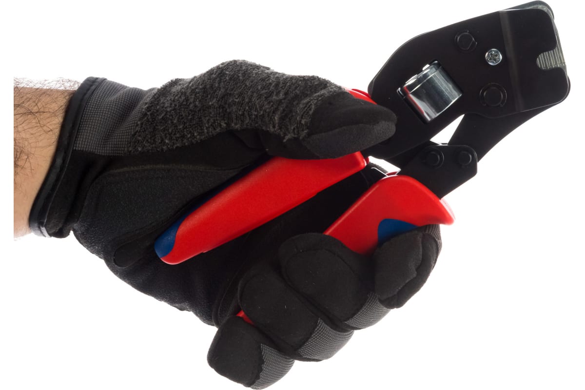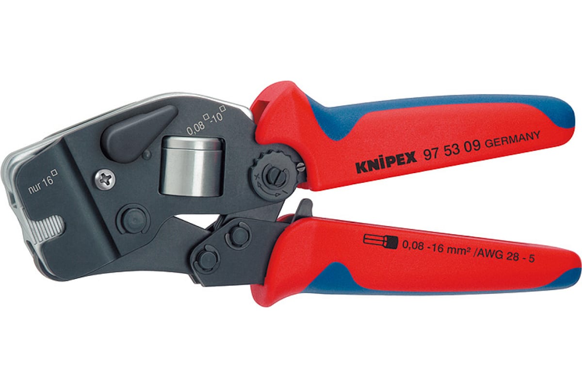 Ручной обжимник KNIPEX KN-975309 производит автоматический обжим контактных гильз, что значительно ускоряет рабочий процесс. Оснащен специальным рычагом для выбора диапазона опрессовки. Детали инструмента долговечны, т.к. изготовлены из высоколегированного хромванадиевого сплава, закалены в масле. Фронтальная установка удобна при работе в распределительных шкафах. Данная модель исключает ошибку опрессовки при использовании неправильного штампа.Дополнительные характеристики
