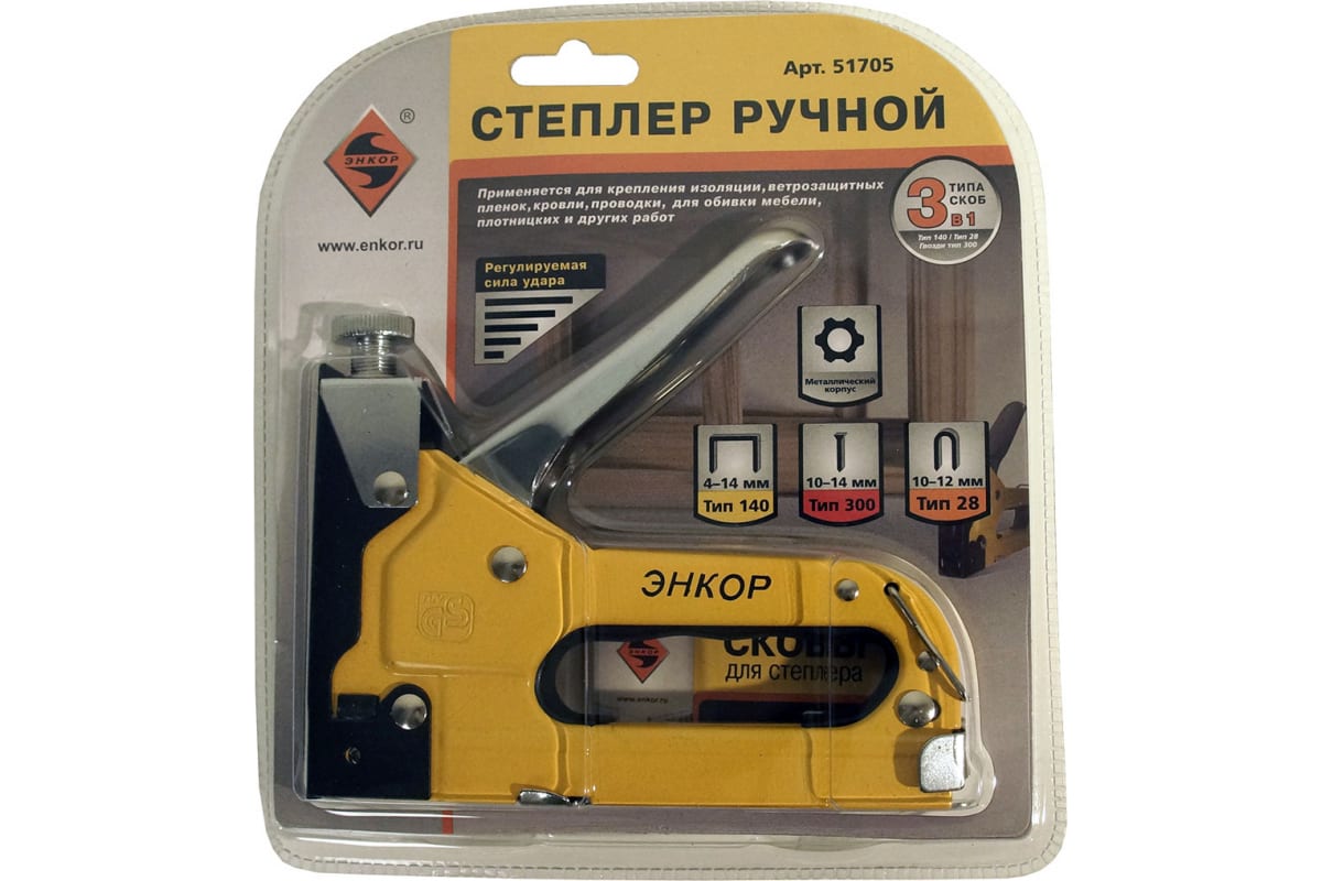 Ручной степлер 3 в 1 Энкор 140 51705 служит для скрепления между собой тонких листов материала. Модель активно используется на производстве мебели. Устройство имеет полностью металлических корпус устойчивый к механическим повреждениям. Благодаря специальному механизму застрявшие скобы легко и быстро извлекаются.