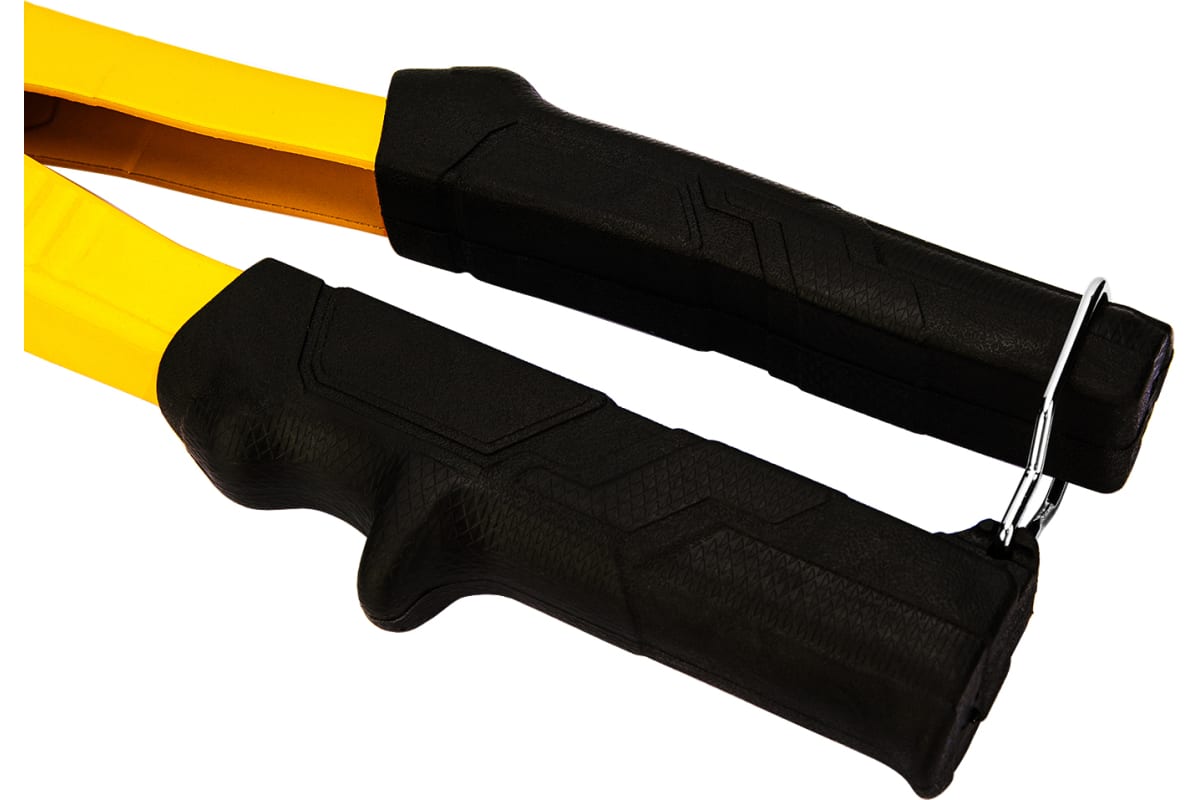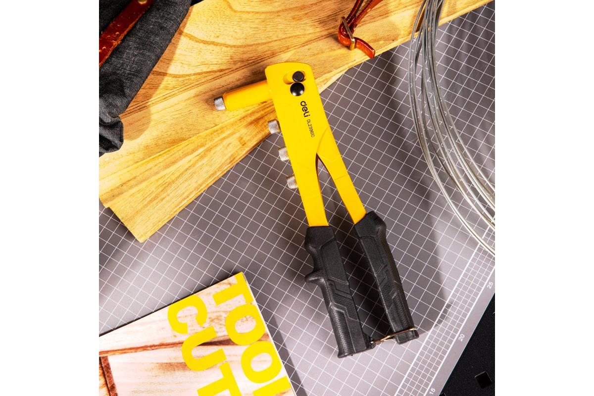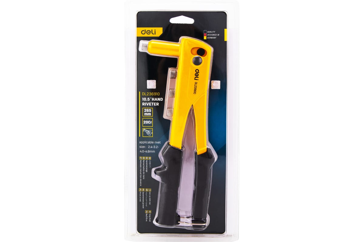 Ручной заклепочник DELI DL236910 98412 изготовлен из высококачественной легированной стали 20Cr, благодаря чему отличается прочностью и долговечностью. В комплект входят 4 насадки для работы с заклёпками разного размера: 2,4 ; 3,2; 4,0; 4,8 мм. Заклепочник оснащён простой и удобной системой замены насадок. Эргономичные накладки на рукояти снижают усталость рук при работе с инструментом.