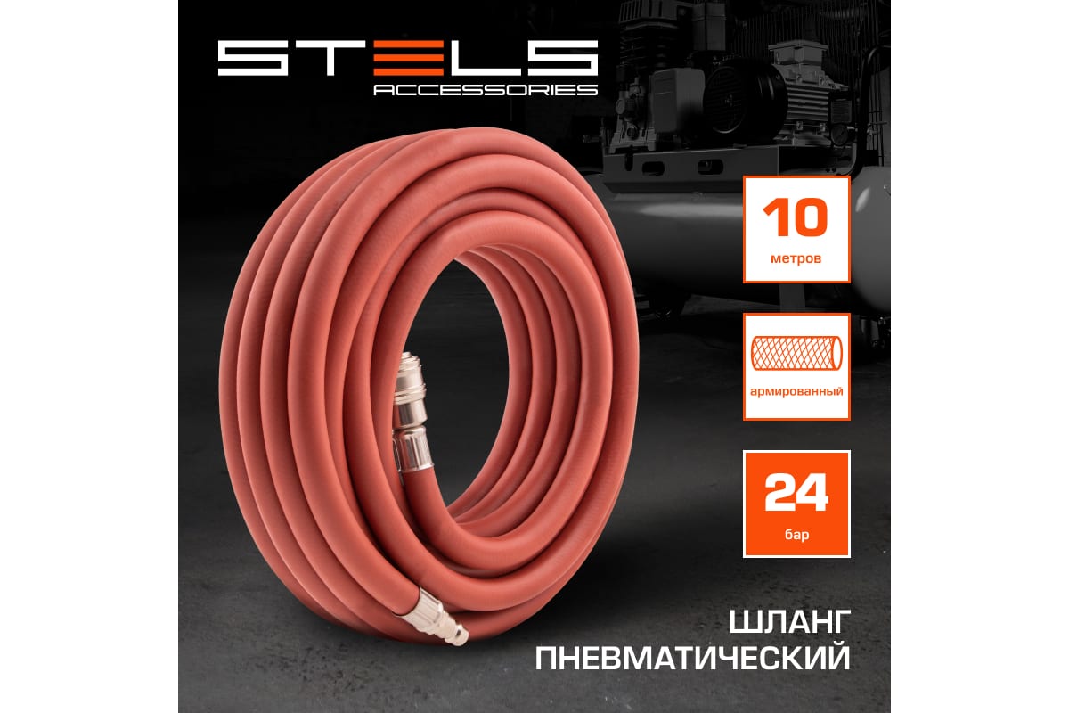 Пневматический армированный резиновый шланг Stels 57021, 10 х 16 мм, длиной 10 м, с быстросъемами, служит для подключения пневматического оборудования к компрессору и выдерживает давление до 24 бар. Изготовлен из резины и армирован капроновой нитью, что обеспечивает высокую устойчивость к механическому воздействию и пережатию, а также к перепадам температур. Может использоваться для прокладки воздушной магистрали. Шланг пригодится на производстве, строительной площадке и в автосервисе.