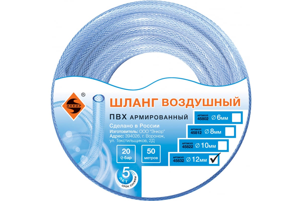 Шланг ПВХ Энкор 45832 предназначен для подачи воздуха под давлением. Изготовлен из ПВХ, имеет встречно-диагональное армирование, обеспечивающее стойкость к заломам и скручиванию, отсутствие перегибов и узлов, повышенную гибкость и устойчивость к давлению воздуха. Шланг устойчив к воздействию УФ-излучения, имеет длительный срок эксплуатации.