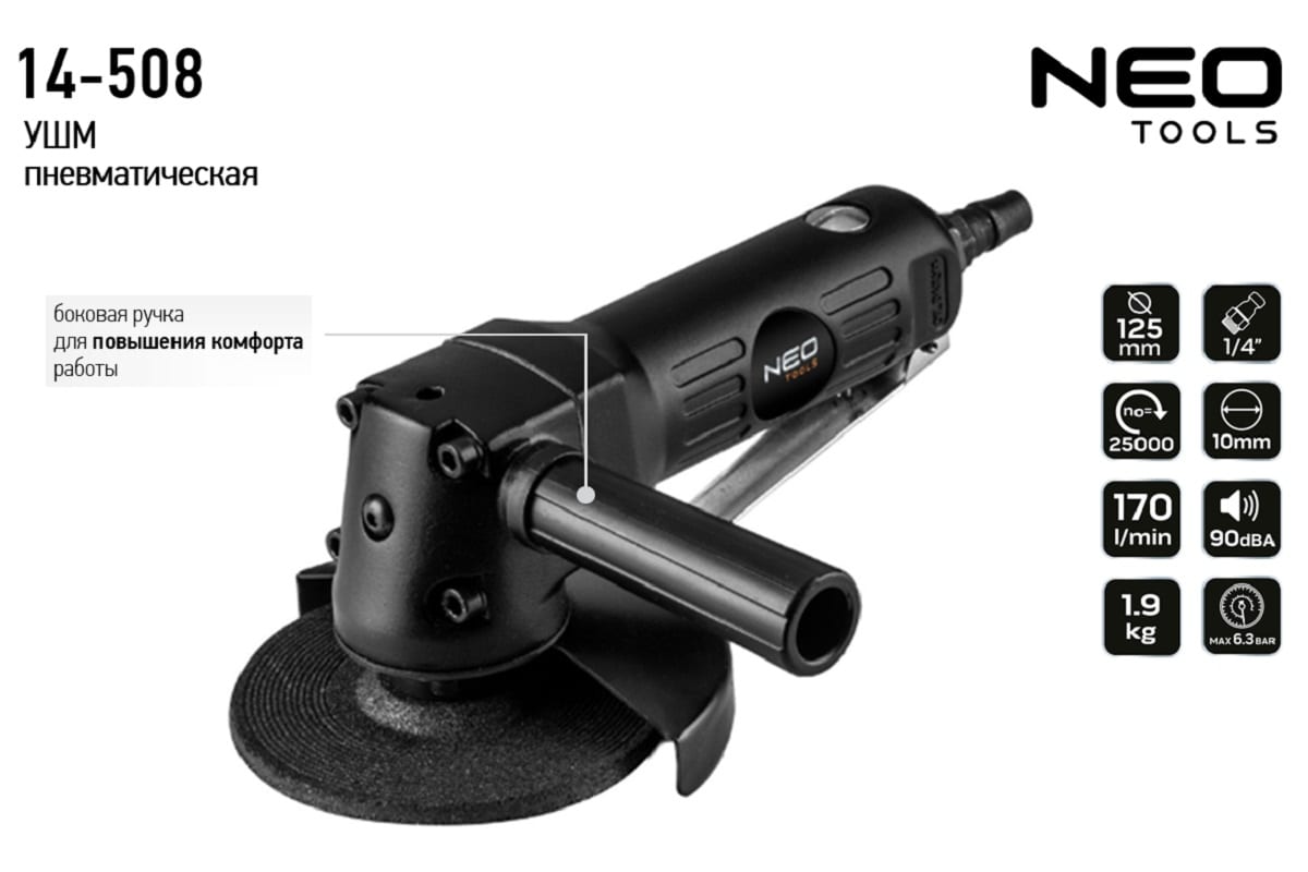 Шлифовальная угловая пневматическая машина NEO 125 мм, 10000 об/мин 14-508 применяется для шлифования поверхностей.