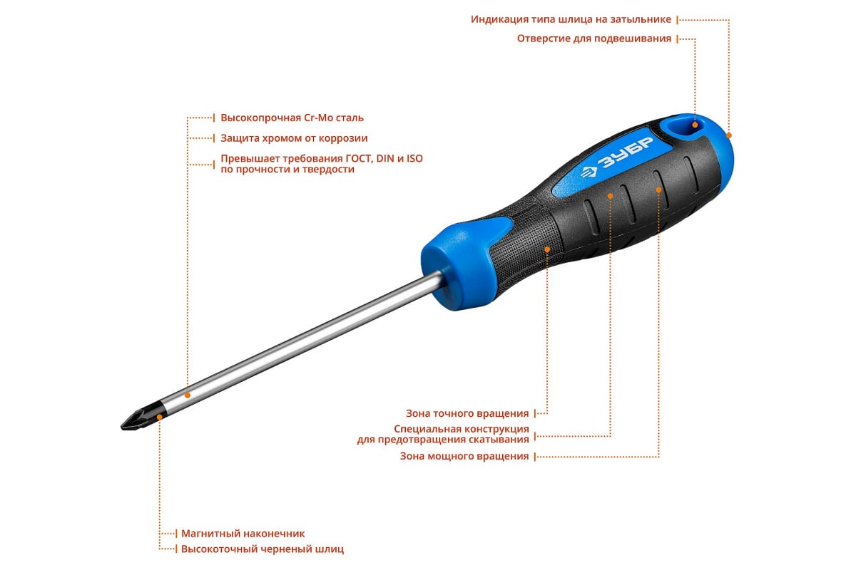 Преимущества отвертки ЗУБР 25233-3- Хромомолибденовая сталь выдерживает даже высокие нагрузки.