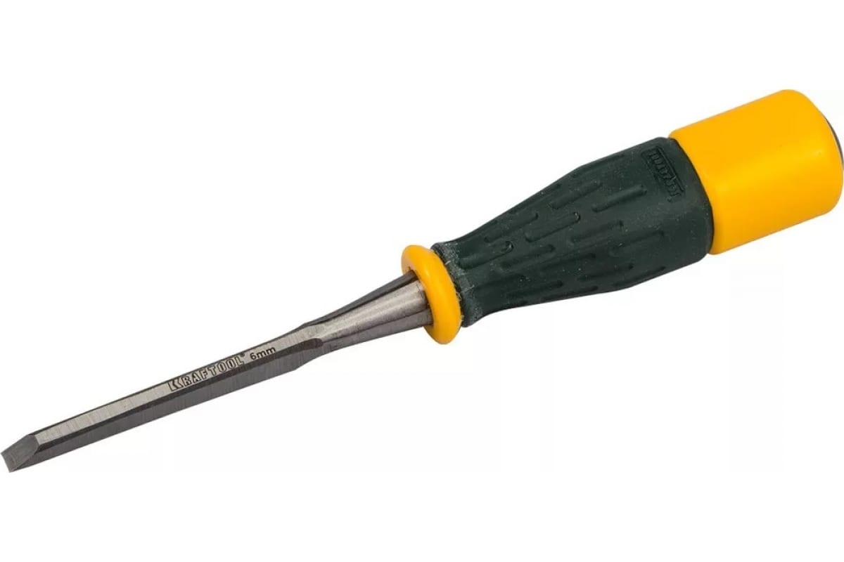 Стамеска, упрочненное полотно, ударопрочная двухкомпонентная ручка, стальной затыльник для ударных работ, 6мм KRAFTOOL EXPERT 1815-06_z01 - ручной инструмент для вырубки в деревянных заготовках гнезд и отверстий, зачистки пазов, снятия фасок и пр. Подходит для работы совместно с ударным инструментом.