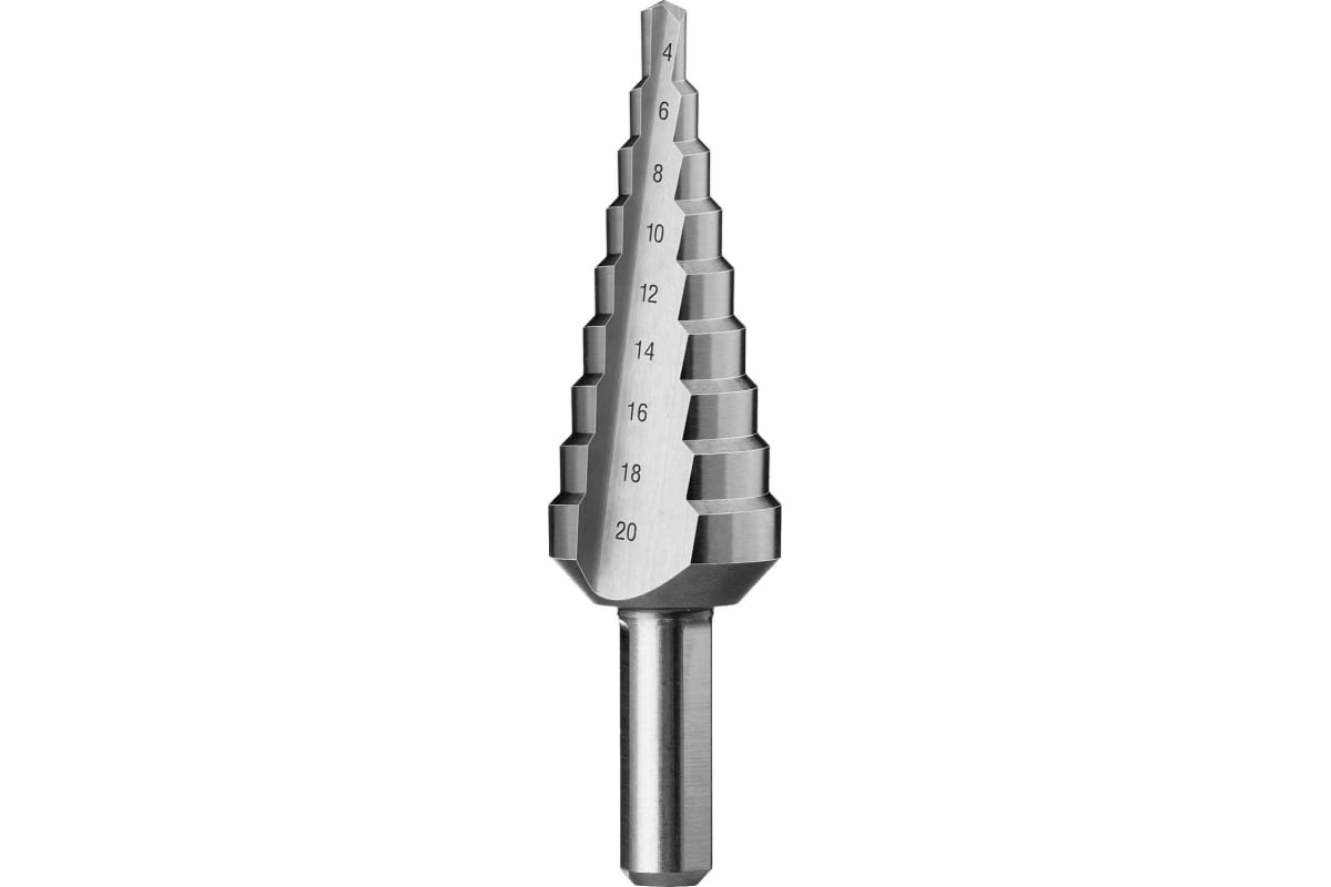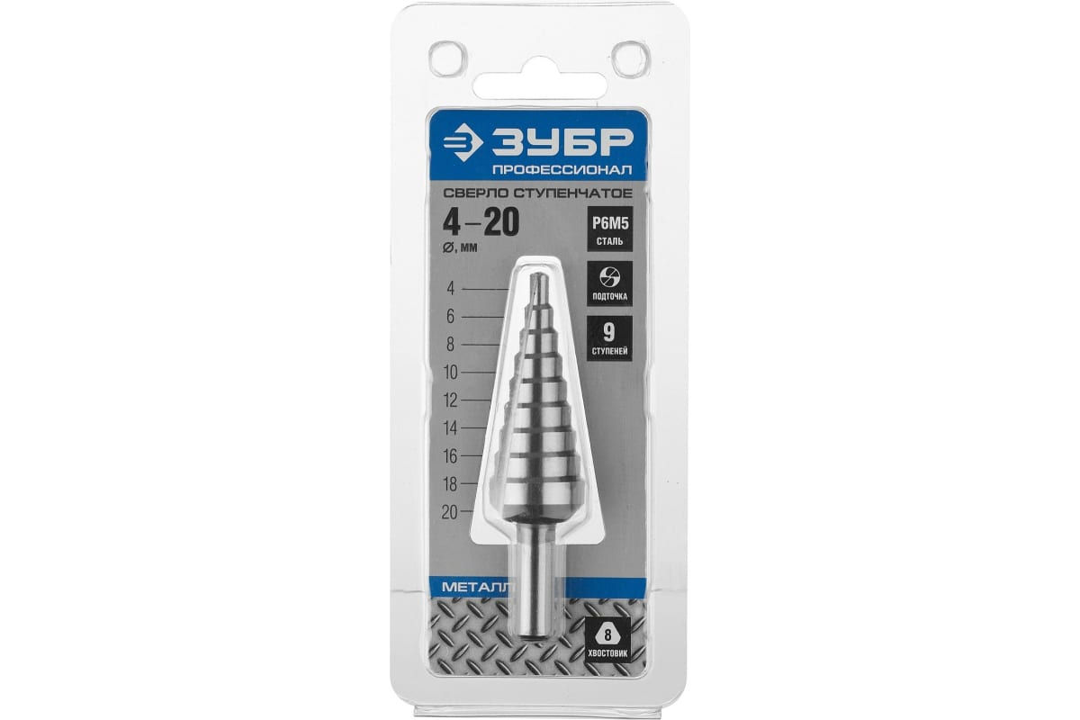 Сверло ступенчатое ЗУБР 29670-4-20-9_z01 предназначено для сверления металлических конструкций и заготовок, листовых материалов, цветных металлов, пластика. Рекомендованы для использования для сверления листового металла толщиной до 4мм, цветных металлов, пластмасс и других материалов. Крестообразная подточка позволяет начать сверление без предварительных работ. Угол заточки при вершине равный 135° для ускорения процесса сверления. Сверло изготовлено методом вышлифовки из быстрорежущей стали Р6М5 и соответствует классу точности "А1" .