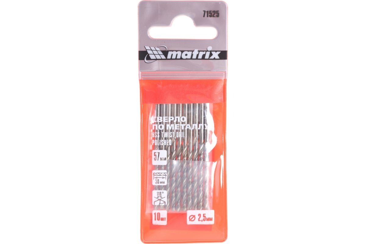 Полированное сверло по металлу Matrix 71525 из стали HSS, с цилиндрическим хвостовиком, 10 шт. в упаковке, используется для получения отверстий диаметром 2,5 мм. Угол заточки составляет 118 градусов, поэтому сверло оптимально для работы с черными металлами, сталью, чугуном и твердой бронзой.