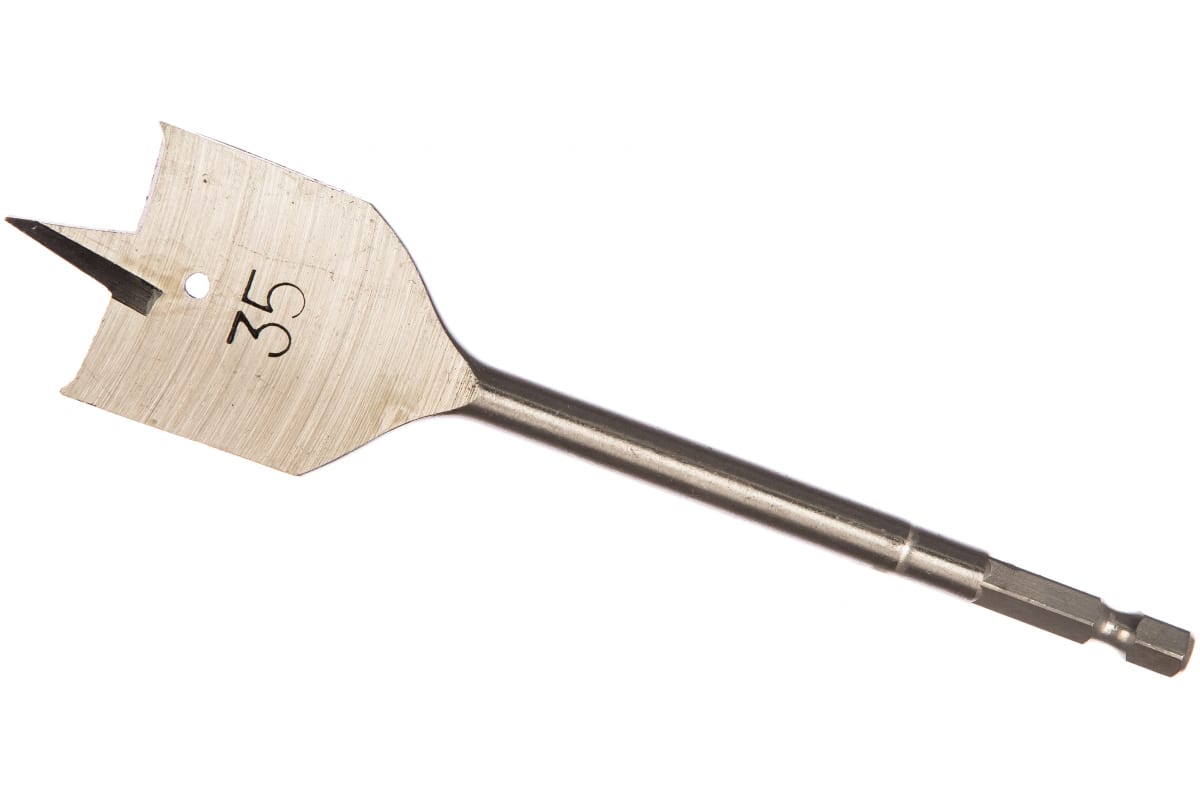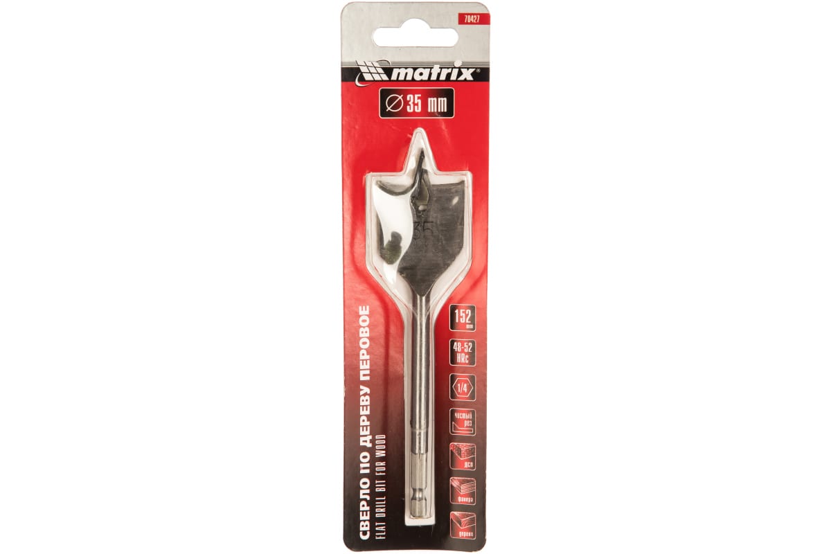 Перовое сверло по дереву Matrix 70427 диаметром 35 мм, с 6-гранным хвостовиком, имеет рабочую часть в виде «лопатки» с режущими кромками по бокам, поэтому эффективно для сверления глубоких сквозных и глухих отверстий. Оснастка устанавливается на ручную механическую или электрическую дрель, сверлильный станок, с ее помощью можно сверлить древесину любых пород.