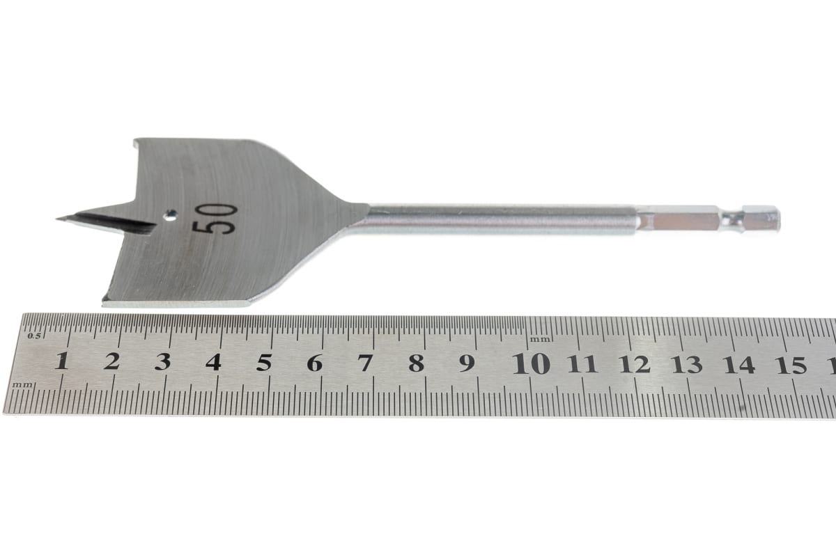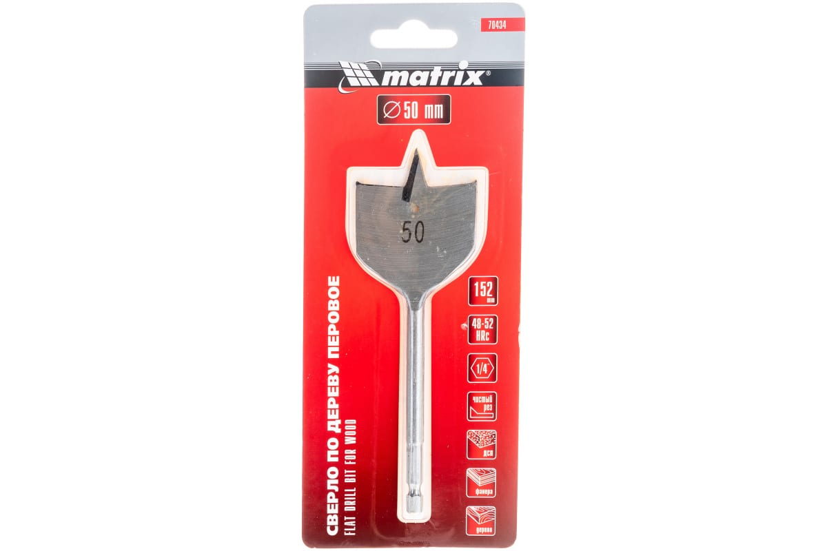 Перовое сверло по дереву Matrix 70434 диаметром 50 мм, с 6-гранным хвостовиком, имеет рабочую часть в виде «лопатки» с режущими кромками по бокам, поэтому эффективно для сверления глубоких сквозных и глухих отверстий. Оснастка устанавливается на ручную механическую или электрическую дрель, сверлильный станок, с ее помощью можно сверлить древесину любых пород.