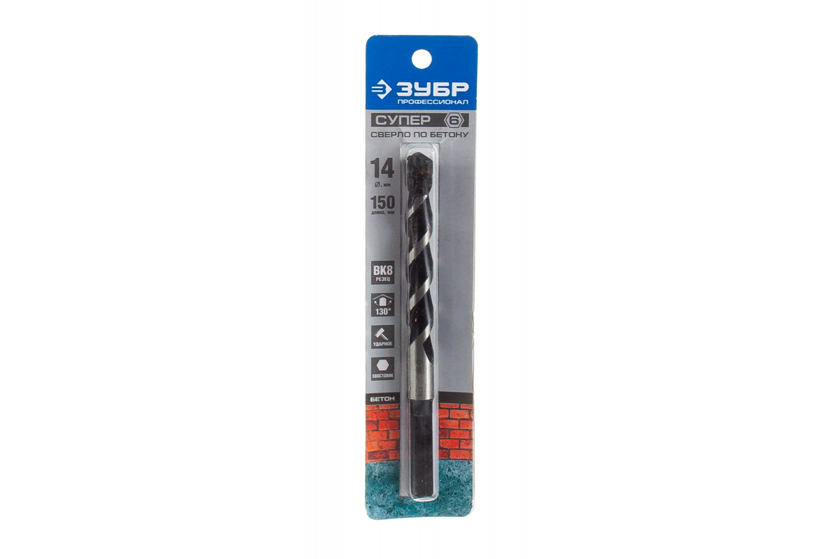 Сверло Зубр 2916-150-14 серии "Супер-6" используется совместно с ударными дрелями для сверления конструкций из бетона, кирпича, камня, плотных известняков. Имеет твердосплавный наконечник марки ВК8. Использование данного сплава позволяет существенно повысить скорость обработки и рабочий ресурс сверла. П-образная форма спирали обеспечивает эффективный и быстрый отвод сверлильной пыли из зоны обработки. Угол заточки при вершине 130 . Шестигранный хвостовик способствует надежному закреплению сверла в патроне. Сверло изготовлено из высокопрочной стали, имеет хорошую износостойкость.