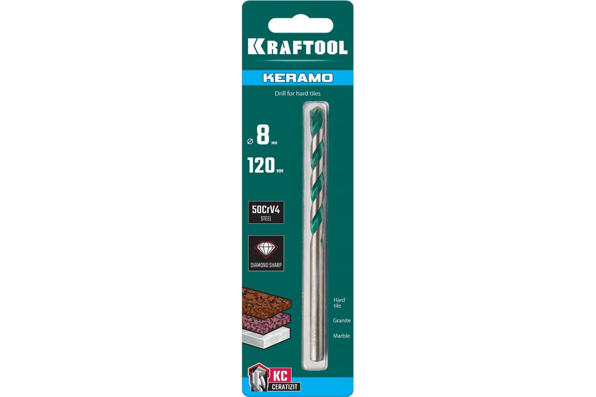 Сверло по керамограниту KRAFTOOL Keramo 8x120 мм 29175-120-8 благодаря специальной твердосплавной пластине и алмазной заточке режущих кромок уверенно проходит через керамогранит, мрамор, гранит и прочие твердые материалы.